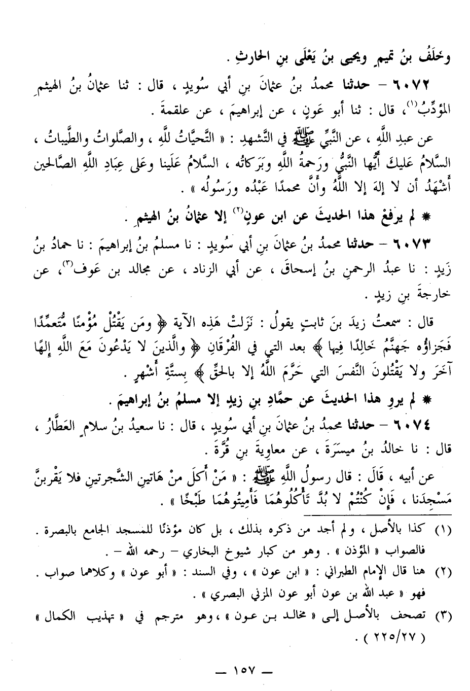 6072 - حَدَّثَنَا مُحَمَّدُ بْنُ عُثْمَانَ بْنِ أَبِي سُوَيْدٍ قَالَ: ثَنَا عُثْمَانُ بْنُ الْهَيْثَمِ الْمُؤَدِّبُ قَالَ: ثَنَا أَبُو عَوْنٍ، عَنْ إِبْرَاهِيمَ، عَنْ عَلْقَمَةَ، عَنْ عَبْدِ اللَّهِ، عَنِ النَّبِيِّ صَلَّى اللهُ عَلَيْهِ وَسَلَّمَ فِي §التَّشَهُّدِ: «التَّحِيَّاتُ لِلَّهِ، وَالصَّلَوَاتُ، وَالطَّيِّبَاتُ، السَّلَامُ عَلَيْكَ أَيُّهَا النَّبِيُّ وَرَحْمَةُ اللَّهِ وَبَرَكَاتُهُ، السَّلَامُ عَلَيْنَا، وَعَلَى عَبَّادِ اللَّهِ الصَّالِحِينَ أَشْهَدُ أَنْ لَا إِلَهَ إِلَّا اللَّهُ، وَأَنَّ مُحَمَّدًا عَبْدُهُ وَرَسُولُهُ» لَمْ يَرْفَعْ هَذَا الْحَدِيثَ عَنِ ابْنِ عَوْنٍ إِلَّا عُثْمَانُ بْنُ الْهَيْثَمِ "