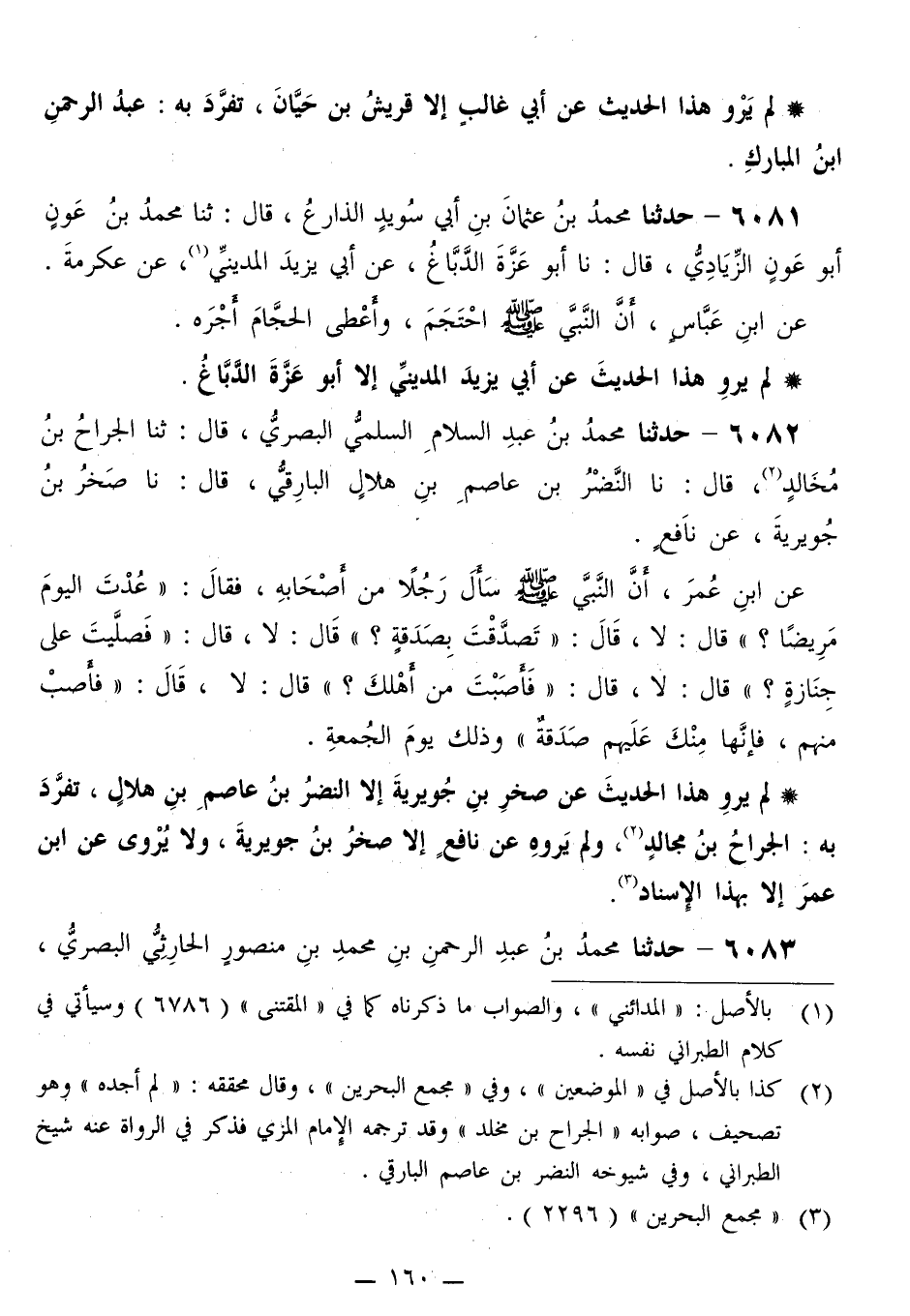 6082 - حَدَّثَنَا مُحَمَّدُ بْنُ عَبْدِ السَّلَامِ السَّلَمِيُّ الْبَصْرِيُّ قَالَ: ثَنَا الْجَرَّاحُ بْنُ مَخْلَدٍ قَالَ: نا النَّضْرُ بْنُ عَاصِمِ بْنِ هِلَالٍ الْبَارِقِيُّ قَالَ: نا صَخْرُ بْنُ جُوَيْرِيَةَ، عَنْ نَافِعٍ، عَنِ ابْنِ عُمَرَ، أَنَّ النَّبِيَّ صَلَّى اللهُ عَلَيْهِ وَسَلَّمَ سَأَلَ رَجُلًا مِنْ أَصْحَابِهِ، فَقَالَ: «§عُدْتَ الْيَوْمَ مَرِيضًا؟» قَالَ: لَا قَالَ: «تَصَدَّقْتَ بِصَدَقَةٍ؟» قَالَ: لَا قَالَ: «فَصَلَّيْتَ عَلَى جِنَازَةٍ؟» قَالَ: لَا قَالَ: «فَأَصَبْتَ مِنْ أَهْلِكَ؟» قَالَ: لَا قَالَ: «فَأَصِبْ مِنْهُمْ، فَإِنَّهَا مِنْكَ عَلَيْهِمْ صَدَقَةً» ، وَذَلِكَ يَوْمَ الْجُمُعَةِ «