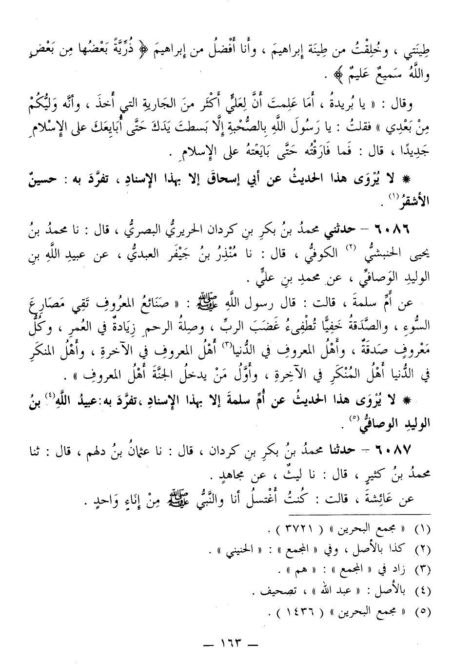 6086 - حَدَّثَنِي مُحَمَّدُ بْنُ بَكْرِ بْنِ كُرْدَانَ الْحَرِيرِيُّ الْبَصْرِيُّ قَالَ: نا مُحَمَّدُ بْنُ يَحْيَى الْحَنْبَشِيُّ الْكُوفِيُّ قَالَ: نا مُنْذِرُ بْنُ جَيْفَرٍ الْعَبْدِيُّ، عَنْ عُبَيْدِ اللَّهِ بْنِ الْوَلِيدِ الْوَصَّافِيِّ، عَنْ مُحَمَّدِ بْنِ عَلِيٍّ، عَنْ أُمِّ سَلَمَةَ، قَالَتْ: قَالَ رَسُولُ اللَّهِ صَلَّى اللهُ عَلَيْهِ وَسَلَّمَ: «§صَنَائِعُ الْمَعْرُوفِ تَقِي مَصَارِعَ السَّوْءِ، وَالصَّدَقَةُ خَفِيًّا تُطْفِئُ غَضَبَ الرَّبِّ، وَصِلَةُ الرَّحِمِ زِيَادَةٌ فِي الْعُمُرِ، وَكُلُّ مَعْرُوفٍ صَدَقَةٌ، وَأَهْلُ الْمَعْرُوفِ فِي الدُّنْيَا أَهْلُ الْمَعْرُوفِ فِي الْآخِرَةِ، وَأَهْلُ الْمُنْكَرِ فِي الدُّنْيَا أَهْلُ الْمُنْكَرِ فِي الْآخِرَةِ، وَأَوَّلُ مَنْ يَدْخُلُ الْجَنَّةَ أَهْلُ الْمَعْرُوفِ»
