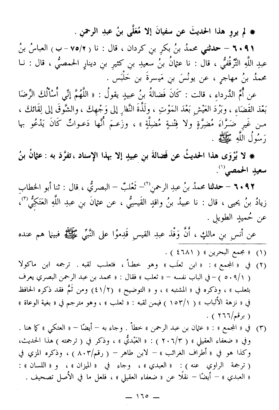 6091 - حَدَّثَنِي مُحَمَّدُ بْنُ بَكْرِ بْنِ كُرْدَانَ قَالَ: نا الْعَبَّاسُ بْنُ عَبْدِ اللَّهِ التَّرْقُفِيُّ قَالَ: نا عُثْمَانُ بْنُ سَعِيدِ بْنِ كَثِيرِ بْنِ دِينَارٍ الْحِمْصِيُّ قَالَ: نا مُحَمَّدُ بْنُ مُهَاجِرٍ، عَنْ يُونُسَ بْنِ مَيْسَرَةَ بْنِ حَلْبَسٍ، عَنْ أُمِّ الدَّرْدَاءِ، قَالَتْ: كَانَ فَضَالَةُ بْنُ عُبَيْدٍ، يَقُولُ: «§اللَّهُمَّ إِنِّي أَسْأَلُكَ الرِّضَا بَعْدَ الْقَضَاءِ، وَبَرْدَ الْعَيْشِ بَعْدَ الْمَوْتِ، وَلَذَّةَ النَّظَرِ إِلَى وَجْهِكَ، وَالشَّوْقَ إِلَى لِقَائِكَ، مِنْ غَيْرِ ضَرَّاءَ مُضِرَّةٍ، وَلَا فِتْنَةٍ مُضِلَّةٍ» ، وَزَعَمَ أَنَّهَا دَعَوَاتٌ كَانَ يَدْعُو بِهَا رَسُولُ اللَّهِ صَلَّى اللهُ عَلَيْهِ وَسَلَّمَ «