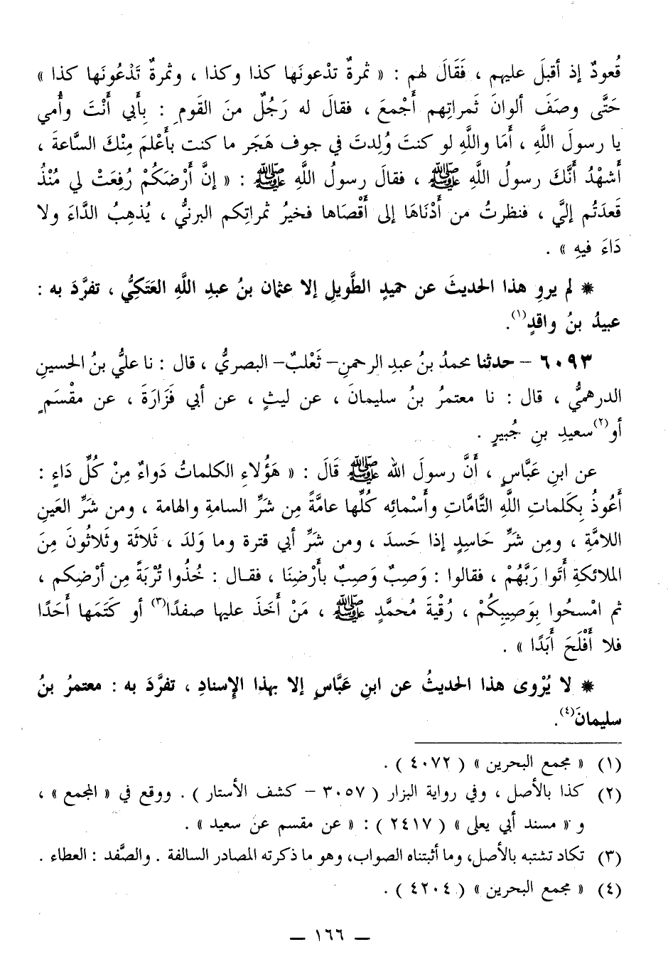 6093 - حَدَّثَنَا مُحَمَّدُ بْنُ عَبْدِ الرَّحْمَنِ ثَعْلَبٌ الْبَصْرِيُّ قَالَ: نا عَلِيُّ بْنُ الْحُسَيْنِ الدِّرْهَمِيُّ قَالَ: نا مُعْتَمِرُ بْنُ سُلَيْمَانَ، عَنْ لَيْثٍ، عَنْ أَبِي فَزَارَةَ، عَنْ مِقْسَمٍ، أَوْ سَعِيدِ بْنِ جُبَيْرٍ، عَنِ ابْنِ عَبَّاسٍ، أَنَّ رَسُولَ اللَّهِ صَلَّى اللهُ عَلَيْهِ وَسَلَّمَ قَالَ: «هَؤُلَاءِ الْكَلِمَاتُ دَوَاءٌ مِنْ كُلِّ دَاءٍ: §أَعُوذُ بِكَلِمَاتِ اللَّهِ التَّامَّاتِ، وَأَسْمَائِهِ كُلِّهَا عَامَّةً مِنْ شَرِّ السَّامَةِ وَالْهَامَةِ، وَمِنْ شَرِّ الْعَيْنِ اللَّامَّةِ، وَمِنْ شَرِّ حَاسِدٍ إِذَا حَسَدَ، وَمِنْ شَرِّ أَبِي قَتَرَةَ، وَمَا وَلَدَ، ثَلَاثَةٌ وَثَلَاثُونَ مِنَ الْمَلَائِكَةِ أَتَوْا رَبَّهُمْ فَقَالُوا: وَصِبٌ وَصِبٌ بِأَرْضِنَا، فَقَالَ: خُذُوا تُرْبَةً مِنْ أَرْضِكُمْ، ثُمَّ امْسَحُوا بِوَصِيبِكُمْ، رُقْيَةَ مُحَمَّدٍ صَلَّى اللهُ عَلَيْهِ وَسَلَّمَ، مَنْ أَخَذَ عَلَيْهَا صَفَدًا أَوْ كَتَمَهَا أَحَدًا فَلَا أَفْلَحَ أَبَدًا»