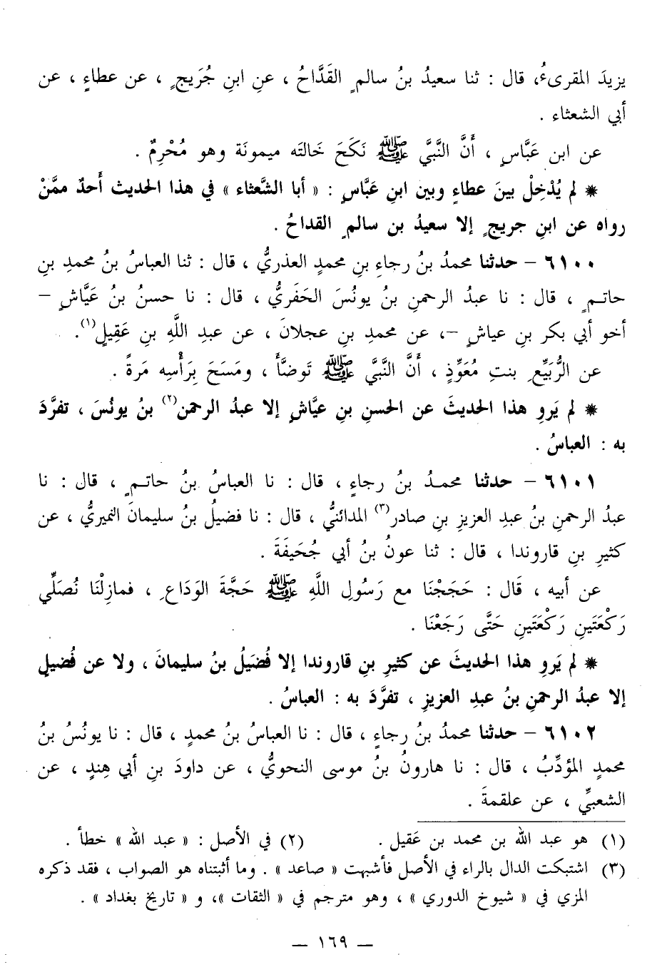 6101 - حَدَّثَنَا مُحَمَّدُ بْنُ رَجَاءٍ قَالَ: نا الْعَبَّاسُ بْنُ حَاتِمٍ قَالَ: نا عَبْدُ الرَّحْمَنِ بْنُ عَبْدِ الْعَزِيزِ بْنِ صَادِرٍ الْمَدَائِنِيُّ قَالَ: نا فُضَيْلُ بْنُ سُلَيْمَانَ النُّمَيْرِيُّ، عَنْ كَثِيرِ بْنِ قَارَوَنْدَا قَالَ: ثَنَا عَوْنُ بْنُ أَبِي جُحَيْفَةَ، عَنْ أَبِيهِ قَالَ: «§حَجَجْنَا مَعَ رَسُولِ اللَّهِ صَلَّى اللهُ عَلَيْهِ وَسَلَّمَ حَجَّةَ الْوَدَاعِ، فَمَا زِلْنَا نُصَلِّي رَكْعَتَيْنِ رَكْعَتَيْنِ حَتَّى رَجَعْنَا»