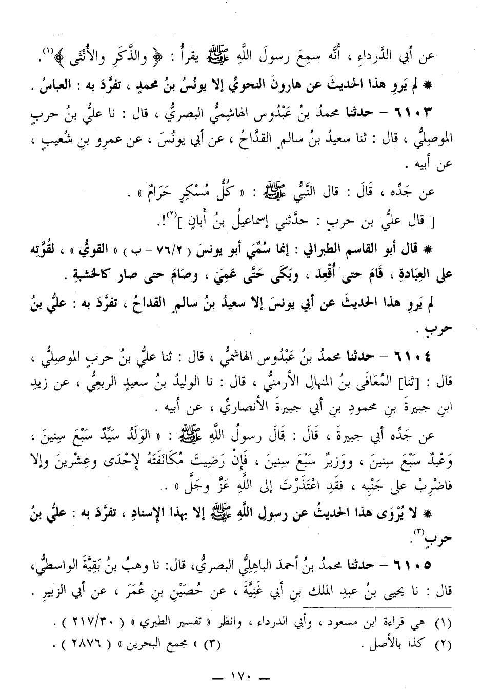 6103 - حَدَّثَنَا مُحَمَّدُ بْنُ عَبْدُوسٍ الْهَاشِمِيُّ الْبَصْرِيُّ قَالَ: نا عَلِيُّ بْنُ حَرْبٍ الْمُوصِلِيُّ قَالَ: ثَنَا سَعِيدُ بْنُ سَالِمٍ الْقَدَّاحُ، عَنْ أَبِي يُونُسَ، عَنْ عَمْرِو بْنِ شُعَيْبٍ، عَنْ أَبِيهِ، عَنْ جَدِّهِ قَالَ: قَالَ النَّبِيُّ صَلَّى اللهُ عَلَيْهِ وَسَلَّمَ: «§كُلُّ مُسْكِرٍ حَرَامٌ» قَالَ عَلِيُّ بْنُ حَرْبٍ: حَدَّثَنِي إِسْمَاعِيلُ بْنُ أَبَانَ، قَالَ أَبُو الْقَاسِمِ الطَّبَرَانِيُّ: «إِنَّمَا سُمَيَّ أَبُو يُونُسَ الْقَوِيَّ، لِقُوَّتِهِ عَلَى الْعِبَادَةِ، قَامَ حَتَّى أُقْعِدَ، وَبَكَى حَتَّى عَمِيَ، وَصَامَ حَتَّى صَارَ كَالْخَشَبَةِ»