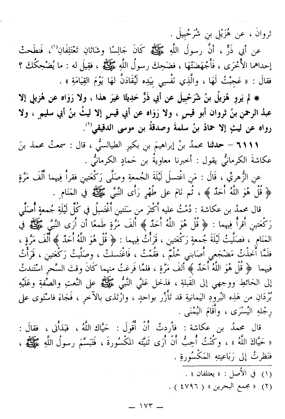 6111 - حَدَّثَنَا مُحَمَّدُ بْنُ إِبْرَاهِيمَ بْنِ بُكَيْرٍ الطَّيَالِسِيُّ قَالَ: سَمِعْتُ مُحَمَّدَ بْنَ عُكَاشَةَ الْكِرْمَانِيُّ، يَقُولُ: أَخْبَرَنَا مُعَاوِيَةُ بْنُ حَمَّادٍ الْكِرْمَانِيُّ، عَنِ الزُّهْرِيِّ قَالَ: «§مِنِ اغْتَسَلَ لَيْلَةَ الْجُمُعَةِ وَصَلَّى رَكْعَتَيْنِ فَقَرَأَ فِيهِمَا أَلْفَ مُرَّةٍ: قُلْ هُوَ اللَّهُ أَحَدٌ، ثُمَّ نَامَ عَلَى طُهْرٍ رَأَى النَّبِيَّ صَلَّى اللهُ عَلَيْهِ وَسَلَّمَ فِي الْمَنَامِ» قَالَ مُحَمَّدُ بْنُ عُكَاشَةَ: «دُمْتُ عَلَيْهِ أَكْثَرَ مِنْ سَنَتَيْنِ أَغْتَسِلُ فِي كُلِّ لَيْلَةِ جُمُعَةٍ، أُصَلِّي رَكْعَتَيْنِ أَقْرَأُ فِيهِمَا: قُلْ هُوَ اللَّهُ أَحَدٌ أَلْفَ مُرَّةٍ طَمَعًا أَنْ أَرَى النَّبِيَّ صَلَّى اللهُ عَلَيْهِ وَسَلَّمَ فِي الْمَنَامِ، فَصَلَّيْتُ لَيْلَةَ جُمُعَةٍ رَكْعَتَيْنِ، قَرَأْتُ فِيهِمَا: قُلْ هُوَ اللَّهُ أَحَدٌ أَلْفَ مُرَّةٍ، فَلَمَّا أَخَذْتُ مَضْجَعِي أَصَابَنِي حُلْمٍ، فَقُمْتُ فَاغْتَسَلَتُ، وَصَلَّيْتُ رَكْعَتَيْنِ، قَرَأْتُ فِيهِمَا: قُلْ هُوَ اللَّهُ أَحَدٌ أَلْفَ مُرَّةٍ، فَلَمَّا فَرَغْتُ مِنْهُمَا كَانَ وَقْتَ السَّحَرِ اسْتَنَدْتُ إِلَى الْحَائِطِ وَوَجْهِي إِلَى الْقِبْلَةِ، فَدَخَلَ عَلَيَّ النَّبِيُّ صَلَّى اللهُ عَلَيْهِ وَسَلَّمَ، عَلَى النَّعْتِ، وَالصِّفَةِ وَعَلَيْهِ بُرْدَانِ مِنْ هَذِهِ الْبُرُودِ الْيَمَانِيَةِ قَدْ تَأَزَّرَ بِوَاحِدٍ، وَارْتَدَى بِالْآخَرِ، فَجَاءَ فَاسْتَوَى عَلَى رِجْلِهِ الْيُسْرَى، وَأَقَامَ الْيُمْنَى» ، قَالَ مُحَمَّدُ بْنُ عُكَاشَةَ: «فَأَرَدْتُ أَنْ أَقُولَ: حَيَّاكَ اللَّهُ، فَبَدَأَنِي، فَقَالَ: حَيَّاكَ اللَّهُ، وَكُنْتُ أُحِبُّ أَنْ أَرَى ثَنِيَّتَهُ الْمَكْسُورَةَ، فَتَبَسَّمَ رَسُولُ اللَّهِ صَلَّى اللهُ عَلَيْهِ وَسَلَّمَ، فَنَظَرْتُ إِلَى رَبَاعِيَتِهِ الْمَكْسُورَةِ.