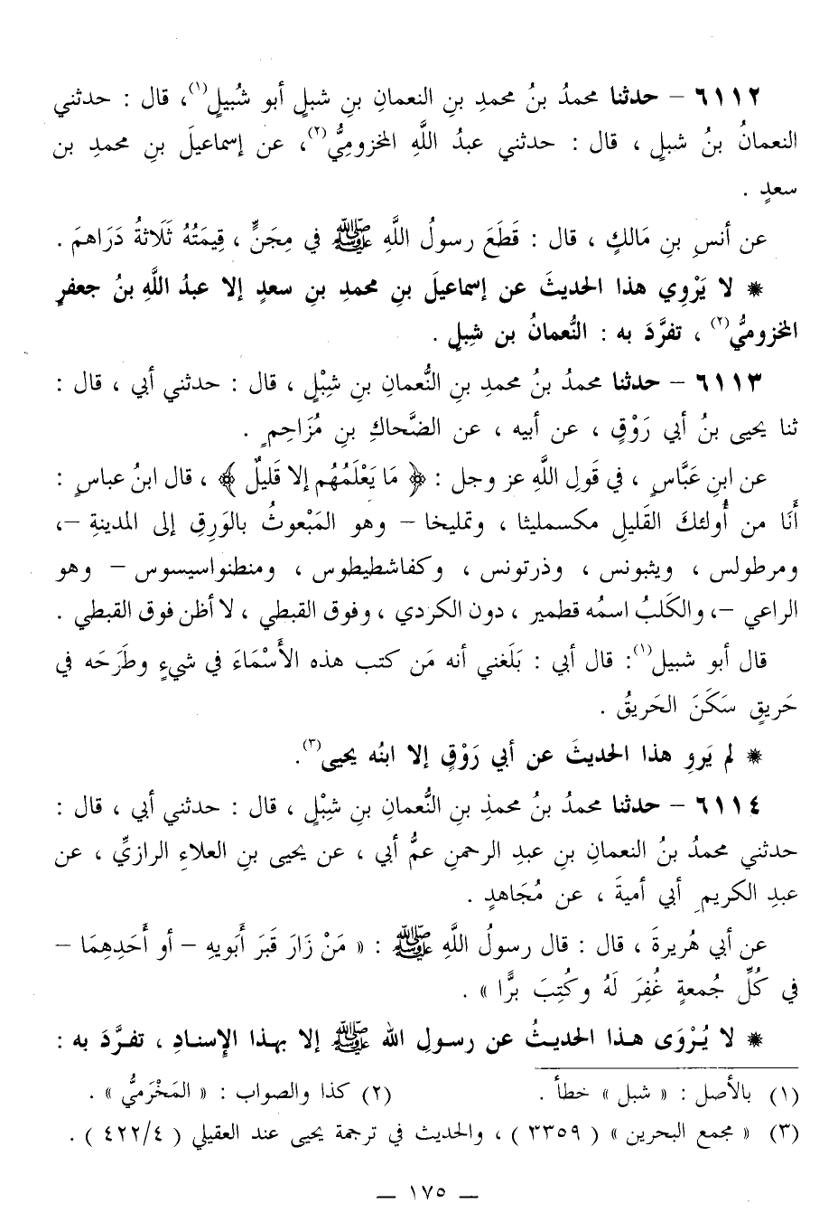 6114 - حَدَّثَنَا مُحَمَّدُ بْنُ مُحَمَّدِ بْنِ النُّعْمَانِ بْنِ شِبْلٍ قَالَ: حَدَّثَنِي أَبِي قَالَ: حَدَّثَنِي مُحَمَّدُ بْنُ النُّعْمَانِ بْنِ عَبْدِ الرَّحْمَنِ، عَمِّ أَبِي، عَنْ يَحْيَى بْنِ الْعَلَاءِ الرَّازِيِّ، عَنْ عَبْدِ الْكَرِيمِ أَبِي أُمَيَّةَ، عَنْ مُجَاهِدٍ، عَنْ أَبِي هُرَيْرَةَ قَالَ: قَالَ رَسُولُ اللَّهِ صَلَّى اللهُ عَلَيْهِ وَسَلَّمَ: «§مَنْ زَارَ قَبْرَ أَبَوَيْهِ أَوْ أَحَدِهِمَا فِي كُلِّ جُمُعَةٍ غُفِرَ لَهُ، وَكُتِبَ بَرًّا»