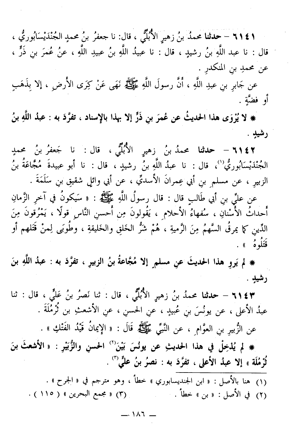 6142 - حَدَّثَنَا مُحَمَّدُ بْنُ زُهَيْرٍ الْأُبُلِّيُّ قَالَ: نا جَعْفَرُ بْنُ مُحَمَّدٍ الْجُنْدِيسَابُورِيُّ قَالَ: نا عَبْدُ اللَّهِ بْنُ رُشَيْدٍ قَالَ: نا أَبُو عُبَيْدَةَ مَجَاعَةُ بْنُ الزُّبَيْرِ، عَنْ مُسْلِمِ بْنِ أَبِي عِمْرَانَ الْأَسَدِيِّ، عَنْ أَبِي وَائِلٍ شَقِيقِ بْنِ سَلَمَةَ، عَنْ عَلِيِّ بْنِ أَبِي طَالِبٍ قَالَ: قَالَ رَسُولُ اللَّهِ صَلَّى اللهُ عَلَيْهِ وَسَلَّمَ: «§سَيَكُونُ فِي آخِرِ الزَّمَانِ أَحْدَاثُ الْأَسْنَانِ، سُفَهَاءُ الْأَحْلَامِ، يَقُولُونَ مِنْ أَحْسَنِ النَّاسِ قَوْلًا، يَمْرُقُونَ مِنَ الدِّينِ كَمَا يَمْرُقُ السَّهْمُ مِنَ الرَّمِيَّةِ، هُمْ شَرُّ الْخَلْقِ، وَالْخَلِيقَةِ، وَطُوبَى لِمَنْ قَتْلَهُمْ أَوْ قَتَلُوهُ»