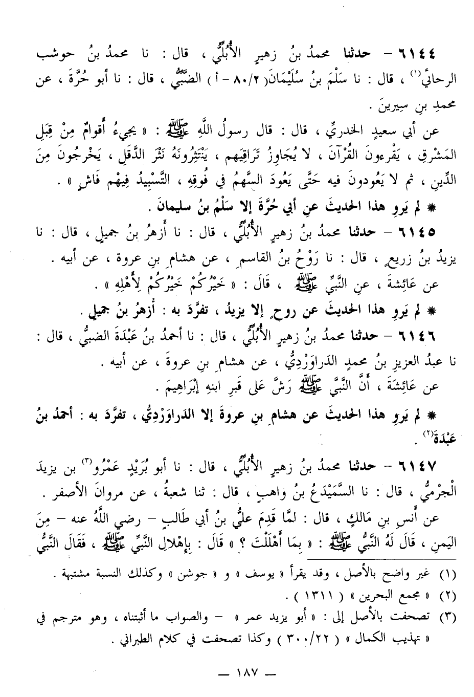6144 - حَدَّثَنَا مُحَمَّدُ بْنُ زُهَيْرٍ الْأُبُلِّيُّ قَالَ: نا مُحَمَّدُ بْنُ حَوْشَبٍ الرَّحَائِيُّ قَالَ: نا سَلْمُ بْنُ سُلَيْمَانَ الضَّبِّيُّ قَالَ: نا أَبُو حَرَّةَ، عَنْ مُحَمَّدِ بْنِ سِيرِينَ، عَنْ أَبِي سَعِيدٍ الْخُدْرِيِّ قَالَ: قَالَ رَسُولُ اللَّهِ صَلَّى اللهُ عَلَيْهِ وَسَلَّمَ: «§يَجِيءُ أَقْوَامٌ مِنْ قِبَلِ الْمَشْرِقِ، يَقْرَءُونَ الْقُرْآنَ، لَا يُجَاوِزُ تَرَاقِيَهُمْ، يَنْتَثِرُونَهُ نَثْرَ الدَّقَلِ، يَخْرُجُونَ مِنَ الدِّينِ، ثُمَّ لَا يَعُودُونَ فِيهِ حَتَّى يَعُودَ السَّهْمُ فِي فُوقِهِ، التَّسْبِيدُ فِيهِمْ فَاشٍ»