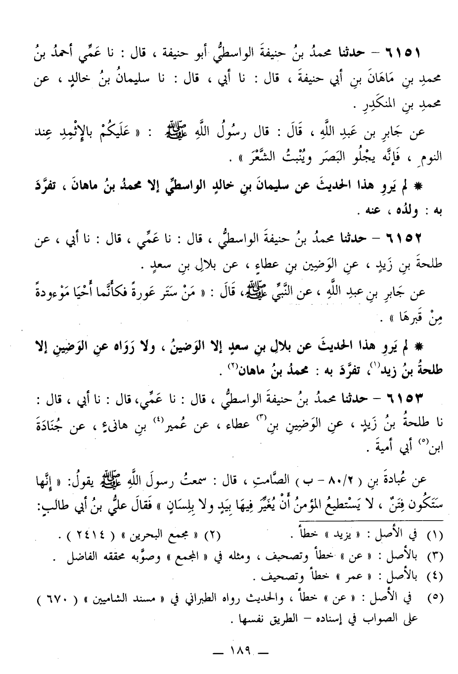 6153 - حَدَّثَنَا مُحَمَّدُ بْنُ حَنِيفَةَ الْوَاسِطِيُّ قَالَ: نا عَمِّي قَالَ: نا أَبِي قَالَ: نا طَلْحَةُ بْنُ زَيْدٍ، عَنِ الْوَضِينِ بْنِ عَطَاءٍ، عَنْ عُمَيْرِ بْنِ هَانِئٍ، عَنْ جُنَادَةَ بْنِ أَبِي أُمَيَّةَ، عَنْ عُبَادَةَ بْنِ الصَّامِتِ قَالَ: سَمِعْتُ رَسُولَ اللَّهِ صَلَّى اللهُ عَلَيْهِ وَسَلَّمَ يَقُولُ: «إِنَّهَا §سَتَكُونُ فِتَنٌ، لَا يَسْتَطِيعُ الْمُؤْمِنُ أَنْ يُغَيِّرَ فِيهَا بَيْدٍ، وَلَا بِلِسَانٍ» ، فَقَالَ عَلِيُّ بْنُ أَبِي طَالِبٍ: -[190]- يَا رَسُولَ اللَّهِ، هَلْ يُنْقِصُ ذَلِكَ مِنْ إِيمَانِهِمْ؟ قَالَ: «لَا، إِلَّا كَمَا يُنْقِصُ الْقَطْرُ مِنَ السِّقَاءِ» قَالَ: وَلِمَ ذَلِكَ؟ قَالَ: «يَكْرَهُونَهُ بِقُلُوبِهِمْ»
