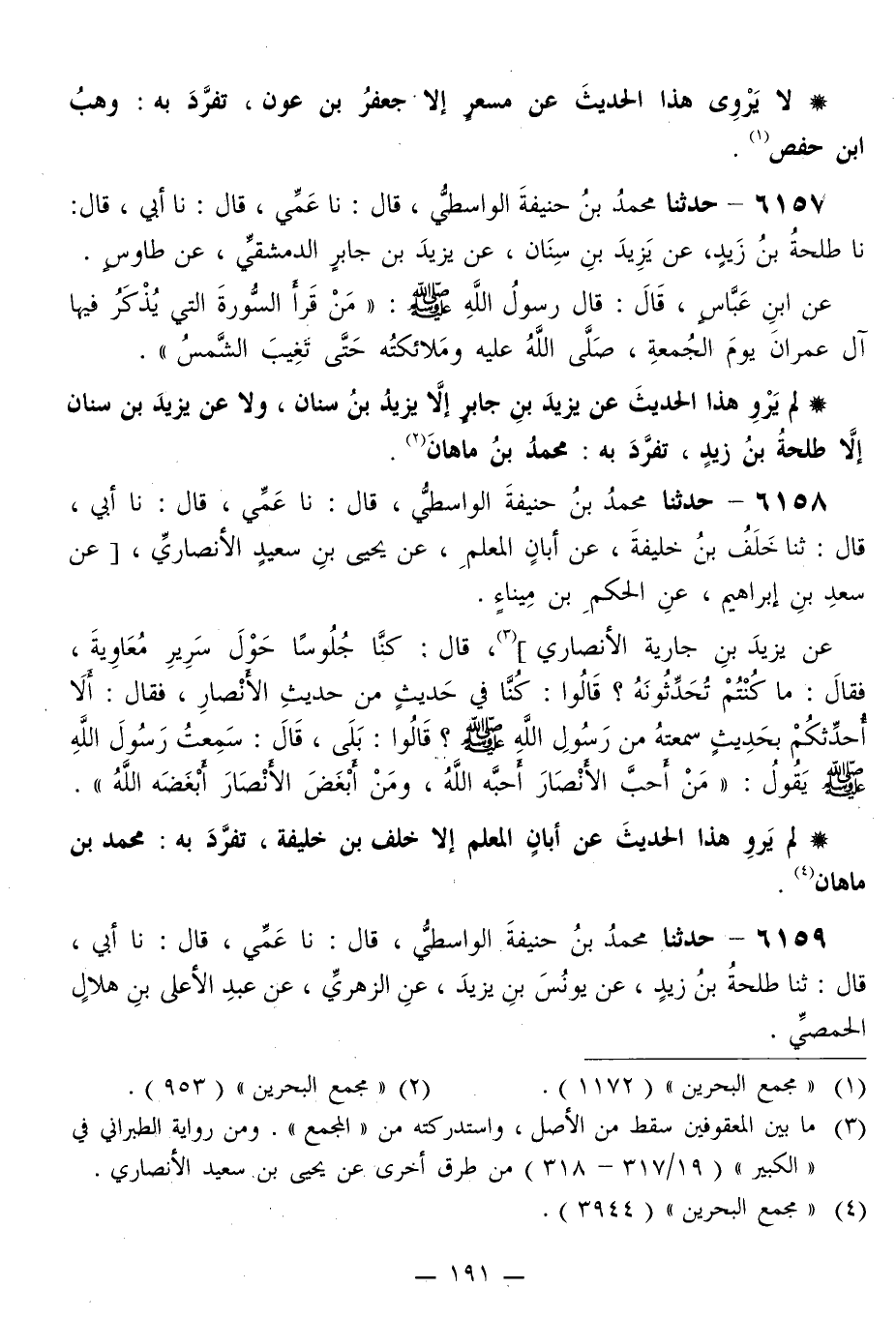 6157 - حَدَّثَنَا مُحَمَّدُ بْنُ حَنِيفَةَ الْوَاسِطِيُّ قَالَ: نا عَمِّي قَالَ: نا أَبِي قَالَ: نا طَلْحَةُ بْنُ زَيْدٍ، عَنْ يَزِيدَ بْنِ سِنَانٍ، عَنْ يَزِيدَ بْنِ جَابِرٍ الدِّمَشْقِيِّ، عَنْ طَاوُسٍ، عَنِ ابْنِ عَبَّاسٍ قَالَ: قَالَ رَسُولُ اللَّهِ صَلَّى اللهُ عَلَيْهِ وَسَلَّمَ: «§مَنْ قَرَأَ السُّورَةَ الَّتِي يُذْكَرُ فِيهَا آلُ عِمْرَانَ يَوْمَ الْجُمُعَةِ، صَلَّى اللَّهُ عَلَيْهِ، وَمَلَائِكَتُهُ حَتَّى تَغِيبَ الشَّمْسُ»