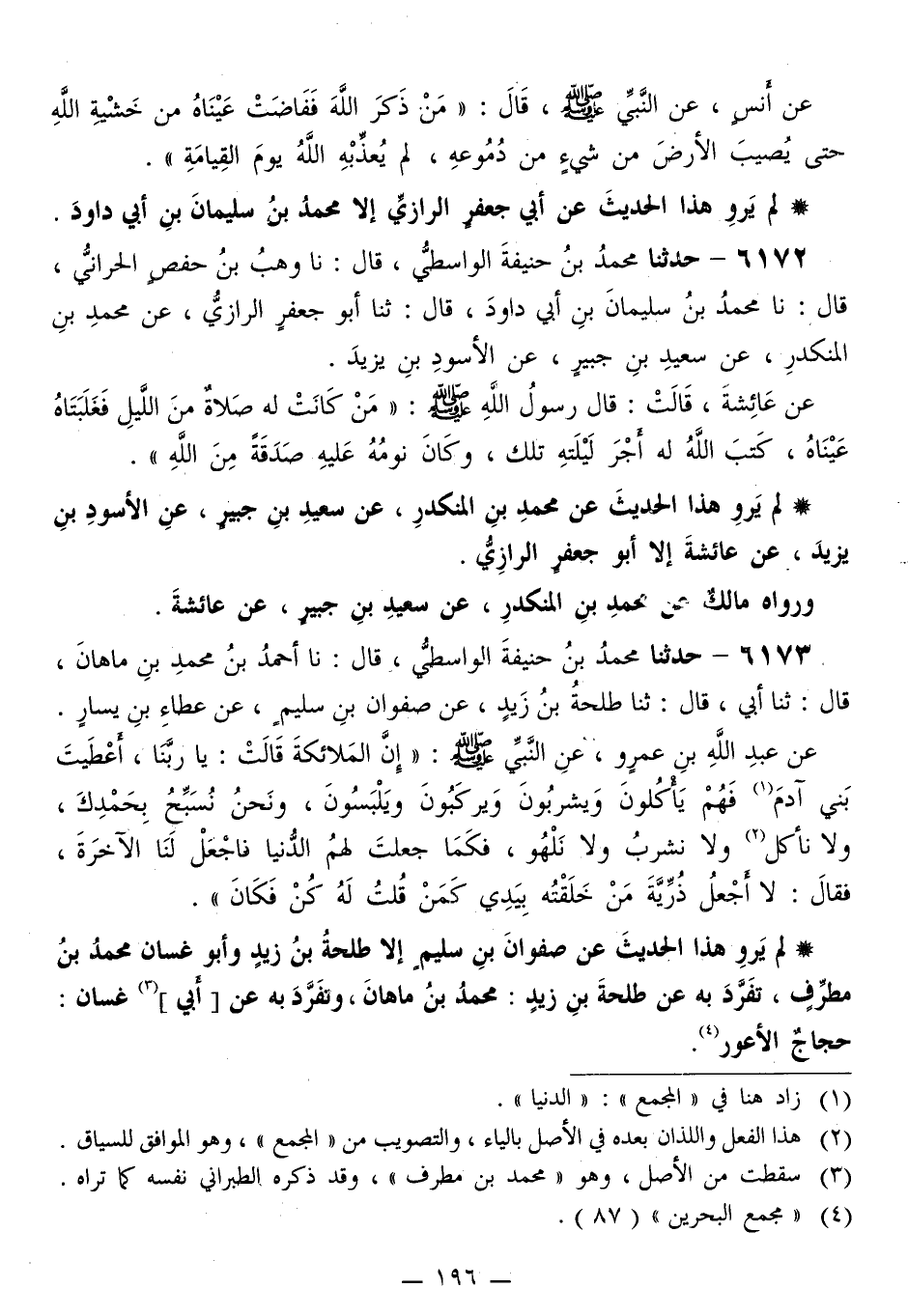 6173 - حَدَّثَنَا مُحَمَّدُ بْنُ حَنِيفَةَ الْوَاسِطِيُّ قَالَ: نا أَحْمَدُ بْنُ مُحَمَّدِ بْنِ مَاهَانَ قَالَ: ثَنَا أَبِي قَالَ: ثَنَا طَلْحَةُ بْنُ زَيْدٍ، عَنْ صَفْوَانَ بْنِ سُلَيْمٍ، عَنْ عَطَاءِ بْنِ يَسَارٍ، عَنْ عَبْدِ اللَّهِ بْنِ عَمْرٍو، عَنِ النَّبِيِّ صَلَّى اللهُ عَلَيْهِ وَسَلَّمَ: «إِنَّ الْمَلَائِكَةَ قَالَتْ: يَا رَبَّنَا، أَعْطَيْتَ بَنِي آدَمَ فَهُمْ يَأْكُلُونَ، وَيَشْرَبُونَ وَيَرْكَبُونَ، وَيُلْبِسُونَ، وَنَحْنُ نُسَبِّحُ بِحَمْدِكَ، وَلَا نَأْكُلُ وَلَا نَشْرَبُ، وَلَا نَلْهُو، فَكَمَا جَعَلْتَ لَهُمُ الدُّنْيَا فَاجْعَلْ لَنَا الْآخِرَةَ، فَقَالَ: §لَا أَجْعَلُ ذُرِّيَّةَ مَنْ خَلَقْتُهُ بِيَدِي كَمَنْ قُلْتُ لَهُ كُنْ فَكَانَ»