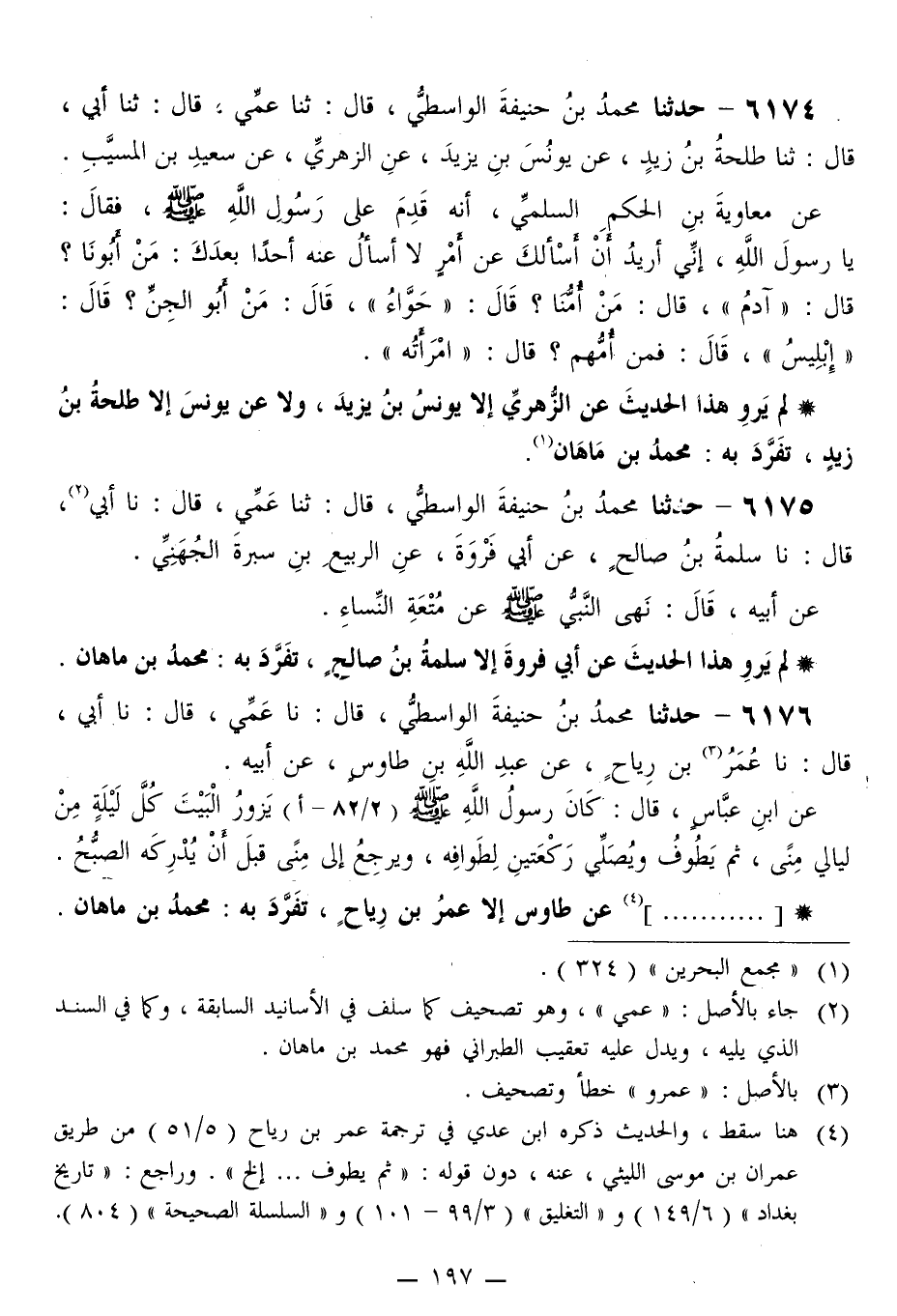 6176 - حَدَّثَنَا مُحَمَّدُ بْنُ حَنِيفَةَ الْوَاسِطِيُّ قَالَ: نا عَمِّي قَالَ: نا أَبِي قَالَ: نا عُمَرُ بْنُ رِيَاحٍ، عَنْ عَبْدِ اللَّهِ بْنِ طَاوُسٍ، عَنِ أَبِيهِ، عَنِ ابْنِ عَبَّاسٍ قَالَ: «كَانَ رَسُولُ اللَّهِ صَلَّى اللهُ عَلَيْهِ وَسَلَّمَ §يَزُورُ الْبَيْتَ كُلَّ لَيْلَةٍ مِنْ لَيَالِي مِنًى، ثُمَّ يَطُوفُ، وَيُصَلِّي رَكْعَتَيْنِ لِطَوَافِهِ، وَيَرْجِعُ إِلَى مِنًى قَبْلَ أَنْ يُدْرِكَهُ الصُّبْحُ» . . . . . . . . . . . . . . «عَنْ طَاوُسٍ إِلَّا عُمَرُ بْنُ رِيَاحٍ، تَفَرَّدَ بِهِ مُحَمَّدُ بْنُ مَاهَانَ»