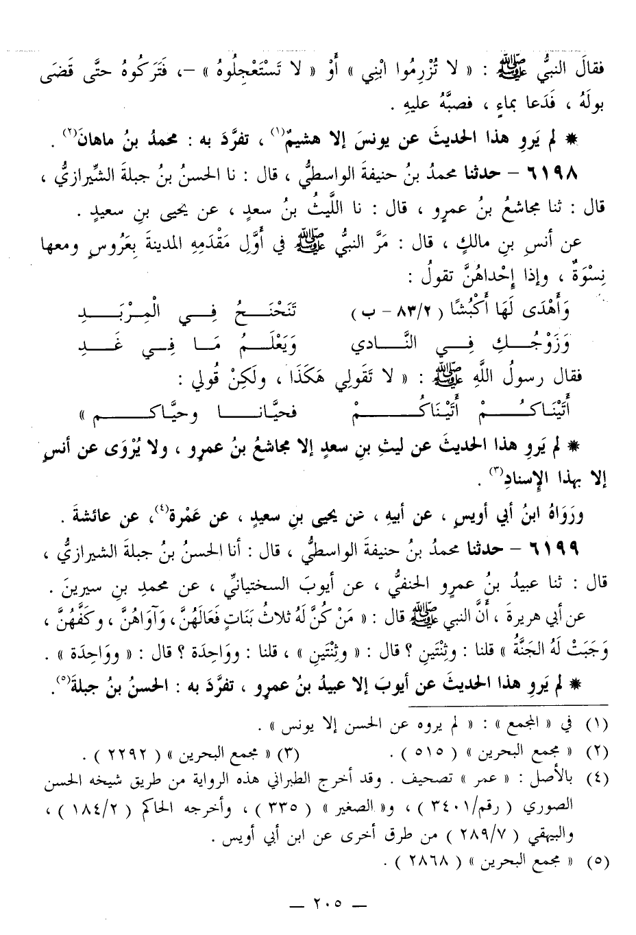 6198 - حَدَّثَنَا مُحَمَّدُ بْنُ حَنِيفَةَ الْوَاسِطِيُّ قَالَ: نا الْحَسَنُ بْنُ جَبَلَةَ الشِّيرَازِيُّ قَالَ: ثَنَا مُجَاشِعُ بْنُ عَمْرٍو قَالَ: نا اللَّيْثُ بْنُ سَعْدٍ، عَنْ يَحْيَى بْنِ سَعِيدٍ، عَنْ أَنَسِ بْنِ مَالِكٍ قَالَ: مَرَّ النَّبِيُّ صَلَّى اللهُ عَلَيْهِ وَسَلَّمَ فِي أَوَّلِ مُقَدِّمَةِ الْمَدِينَةِ بِعَرُوسٍ، وَمَعَهَا نِسْوَةٌ، وَإِذَا إِحْدَاهُنَّ تَقُولُ: