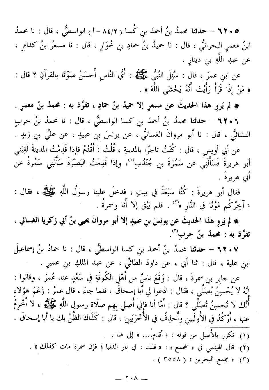 6205 - حَدَّثَنَا مُحَمَّدُ بْنُ أَحْمَدَ بْنُ كُسَا الْوَاسِطِيُّ قَالَ: نا مُحَمَّدُ بْنُ مَعْمَرٍ الْبَحْرَانِيُّ قَالَ: نا حُمَيْدُ بْنُ حَمَّادَ بْنِ خُوَارٍ قَالَ: نا مِسْعَرُ بْنُ كِدَامٍ، عَنْ عَبْدِ اللَّهِ بْنِ دِينَارٍ، عَنِ ابْنِ عُمَرَ قَالَ: سُئِلَ النَّبِيُّ صَلَّى اللهُ عَلَيْهِ وَسَلَّمَ: §أَيُّ النَّاسِ أَحْسَنُ صَوْتًا بِالْقُرْآنِ؟ قَالَ: «مَنْ إِذَا قَرَأَ رَأَيْتَ أَنَّهُ يَخْشَى اللَّهَ»