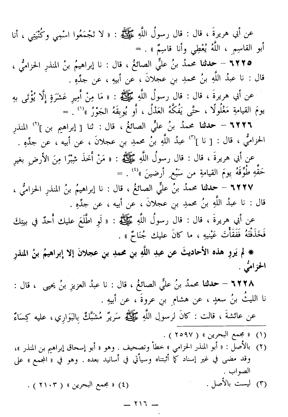 6226 - حَدَّثَنَا مُحَمَّدُ بْنُ عَلِيٍّ الصَّائِغُ قَالَ: ثَنَا إِبْرَاهِيمُ بْنُ الْمُنْذِرِ الْحِزَامِيُّ قَالَ: نا عَبْدُ اللَّهِ بْنُ مُحَمَّدِ بْنِ عَجْلَانَ، عَنْ أَبِيهِ، عَنْ جَدِّهِ، عَنْ أَبِي هُرَيْرَةَ قَالَ: قَالَ رَسُولُ اللَّهِ صَلَّى اللهُ عَلَيْهِ وَسَلَّمَ: «§مَنْ أَخَذَ شِبْرًا مِنَ الْأَرْضِ بِغَيْرِ حَقِّهِ طُوِّقَهُ يَوْمَ الْقِيَامَةِ مِنْ سَبْعِ أَرَضِينَ»