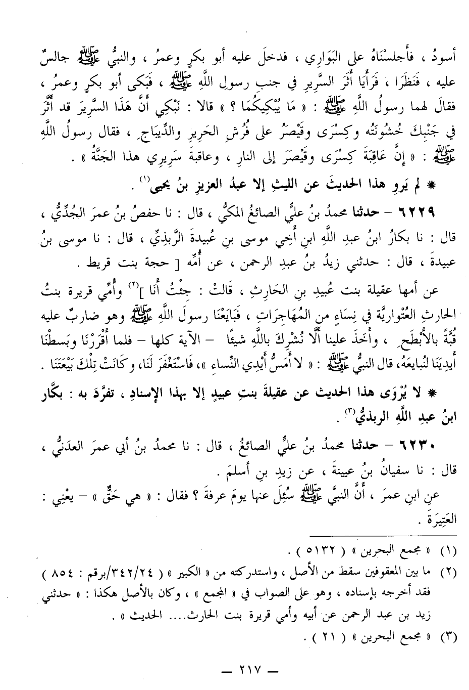 6229 - حَدَّثَنَا مُحَمَّدُ بْنُ عَلِيٍّ الصَّائِغُ الْمَكِّيُّ قَالَ: نا حَفْصُ بْنُ عُمَرَ الْجُدِّيُّ قَالَ: نا بَكَّارُ بْنُ عَبْدِ اللَّهِ ابْنُ أَخِي مُوسَى بْنِ عُبَيْدَةَ الرَّبَذِيُّ قَالَ: نا مُوسَى بْنُ عُبَيْدَةَ قَالَ: حَدَّثَنِي زَيْدُ بْنُ عَبْدِ الرَّحْمَنِ، عَنْ أُمِّهِ حَجَّةَ بِنْتِ قُرَيْطٍ، عَنْ أُمِّهَا عَقِيلَةَ بِنْتِ عُبَيْدِ بْنِ الْحَارِثِ، قَالَتْ: جِئْتُ أَنَا وَأُمِّي، قَرِيرَةُ بِنْتُ الْحَارِثِ الْعُتْوَارِيَّةُ فِي نِسَاءٍ مِنَ الْمُهَاجِرَاتِ، فَبَايَعْنَا رَسُولَ اللَّهِ صَلَّى اللهُ عَلَيْهِ وَسَلَّمَ وَهُوَ ضَارِبٌ عَلَيْهِ قُبَّةً بِالْأَبْطَحِ، وَأَخَذَ عَلَيْنَا أَلَّا نُشْرِكَ بِاللَّهِ شَيْئًا، الْآيَةَ كُلَّهَا، فَلَمَّا أَقْرَرْنَا وَبَسَطْنَا أَيْدِينَا لِنُبَايِعَهُ، قَالَ النَّبِيُّ صَلَّى اللهُ عَلَيْهِ وَسَلَّمَ: «§لَا أَمَسُّ أَيْدِي النِّسَاءِ» فَاسْتَغْفَرَ لَنَا، وَكَانَتْ تِلْكَ بِيعَتَنَا «