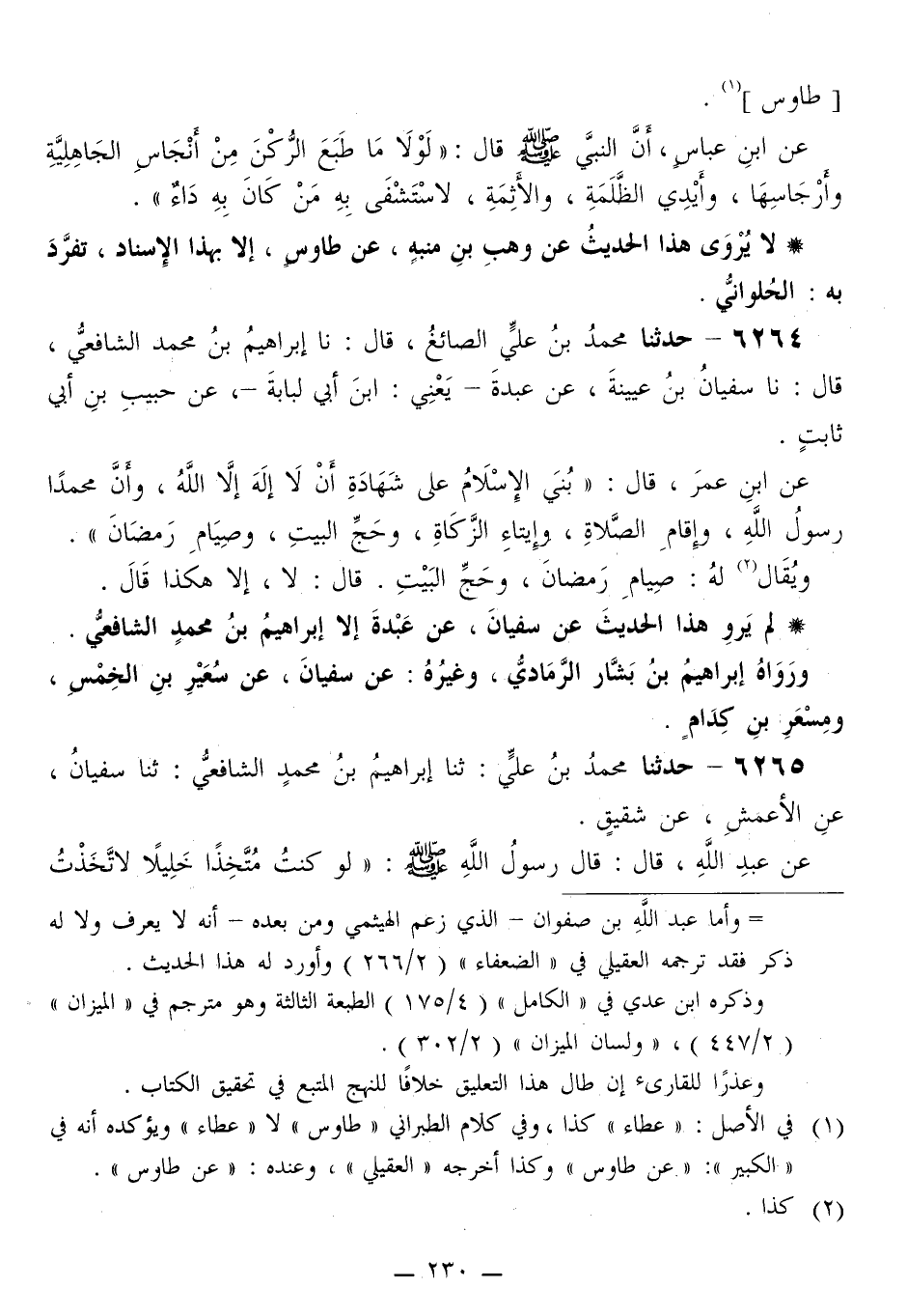 6264 - حَدَّثَنَا مُحَمَّدُ بْنُ عَلِيٍّ الصَّائِغُ قَالَ: نا إِبْرَاهِيمُ بْنُ مُحَمَّدٍ الشَّافِعِيُّ قَالَ: نا سُفْيَانُ بْنُ عُيَيْنَةَ، عَنْ عَبْدَةَ يَعْنِي ابْنَ أَبِي لُبَابَةَ، عَنْ حَبِيبِ بْنِ أَبِي ثَابِتٍ، عَنِ ابْنِ عُمَرَ قَالَ: «§بُنِيَ الْإِسْلَامُ عَلَى شَهَادَةِ أَنْ لَا إِلَهَ إِلَّا اللَّهُ، وَأَنَّ مُحَمَّدًا رَسُولُ اللَّهِ، وَإِقَامِ الصَّلَاةِ، وَإِيتَاءِ الزَّكَاةِ، وَحَجِّ الْبَيْتِ، وَصِيَامِ رَمَضَانَ» وَيُقَالُ لَهُ: صِيَامِ رَمَضَانَ، وَحَجِّ الْبَيْتِ. قَالَ: «لَا، إِلَّا هَكَذَا قَالَ»