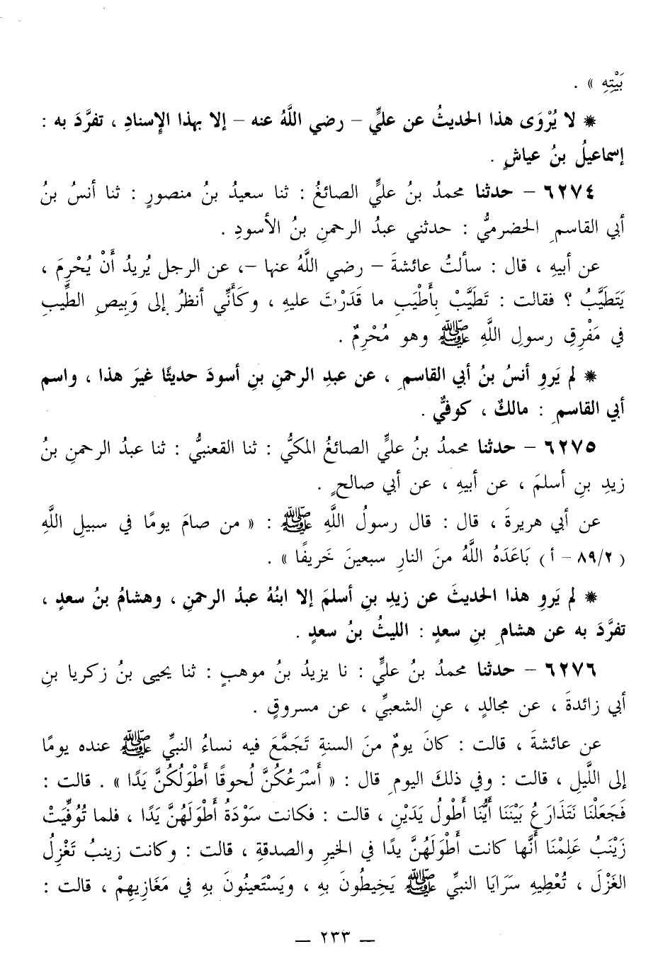 6274 - حَدَّثَنَا مُحَمَّدُ بْنُ عَلِيٍّ الصَّائِغُ، ثَنَا سَعِيدُ بْنُ مَنْصُورٍ، ثَنَا أَنَسُ بْنُ أَبِي الْقَاسِمِ الْحَضْرَمِيُّ، حَدَّثَنِي عَبْدُ الرَّحْمَنِ بْنُ الْأَسْوَدِ، عَنْ أَبِيهِ قَالَ: سَأَلْتُ عَائِشَةَ رَضِيَ اللَّهُ عَنْهَا، عَنِ الرَّجُلِ يُرِيدُ أَنْ يُحْرِمَ، يَتَطَيَّبُ؟ فَقَالَتْ: «تَطَيَّبْ بِأَطْيَبِ مَا قَدَرْتَ عَلَيْهِ، §وَكَأَنِّي أَنْظُرُ إِلَى وَبِيصِ الطِّيبِ فِي مَفْرَقِ رَسُولِ اللَّهِ صَلَّى اللهُ عَلَيْهِ وَسَلَّمَ وَهُوَ مُحْرِمٌ»
