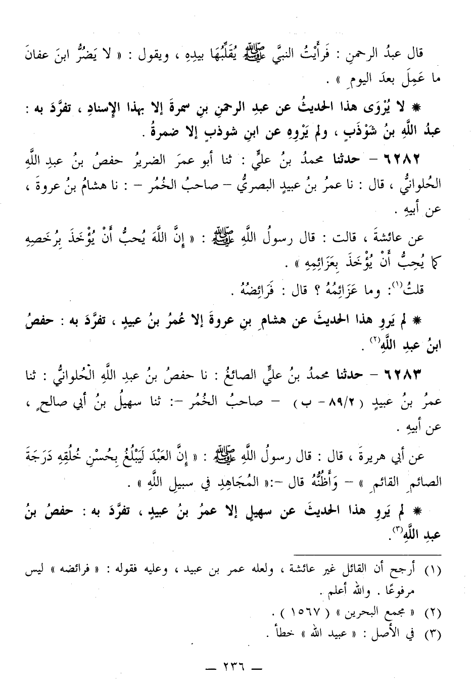 6282 - حَدَّثَنَا مُحَمَّدُ بْنُ عَلِيٍّ، ثَنَا أَبُو عُمَرَ الضَّرِيرُ حَفْصُ بْنُ عَبْدِ اللَّهِ الْحُلْوَانِيُّ قَالَ: نا عُمَرُ بْنُ عُبَيْدٍ الْبَصْرِيُّ صَاحِبُ الْخُمُرِ، نا هِشَامُ بْنُ عُرْوَةَ، عَنْ أَبِيهِ، عَنْ عَائِشَةَ، قَالَتْ: قَالَ رَسُولُ اللَّهِ صَلَّى اللهُ عَلَيْهِ وَسَلَّمَ: «إِنَّ §اللَّهَ يُحِبُّ أَنْ يُؤْخَذَ بِرُخْصَهِ كَمَا يُحِبُّ أَنْ يُؤْخَذَ بِعَزَائِمِهِ» . قُلْتُ: وَمَا عَزَائِمُهُ؟ قَالَ: «فَرَائِضُهُ»