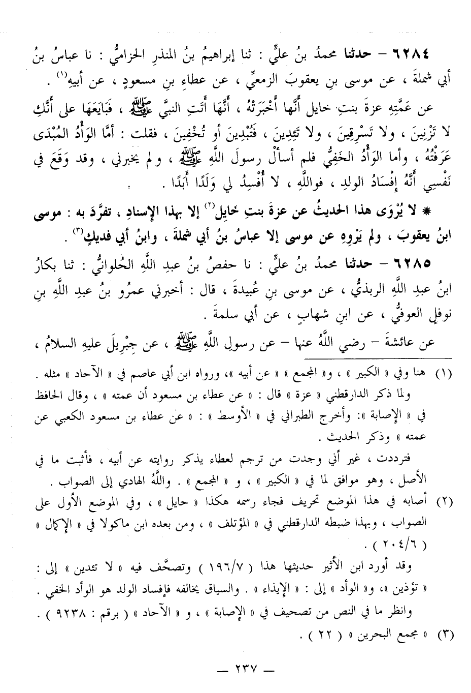 6284 - حَدَّثَنَا مُحَمَّدُ بْنُ عَلِيٍّ، ثَنَا إِبْرَاهِيمُ بْنُ الْمُنْذِرِ الْحِزَامِيُّ، نا عَبَّاسُ بْنُ أَبِي شَمْلَةَ، عَنْ مُوسَى بْنِ يَعْقُوبَ الزَّمْعِيِّ، عَنْ عَطَاءِ بْنِ مَسْعُودٍ، عَنْ أَبِيهِ، عَنْ عَمَّتِهِ، عَزَّةَ بِنْتِ خَايِلٍ أَنَّهَا أَخْبَرَتْهُ، أَنَّهَا: «أَتَتِ النَّبِيَّ صَلَّى اللهُ عَلَيْهِ وَسَلَّمَ، §فَبَايَعَهَا عَلَى أَنَّكِ لَا تَزْنِينَ، وَلَا تَسْرِقِينَ، وَلَا تَئِدِينَ فَتُبْدِينَ أَوْ تُخْفِينَ» فَقُلْتُ: «أَمَّا الْوَأْدُ الْمُبْدَى عَرَفْتُهُ، وَأَمَّا الْوَأْدُ الْخَفِيُّ فَلَمْ أَسْأَلْ رَسُولَ اللَّهِ صَلَّى اللهُ عَلَيْهِ وَسَلَّمَ، وَلَمْ يُخْبِرْنِي، وَقَدْ وَقَعَ فِي نَفْسِي أَنَّهُ إِفْسَادُ الْوَلَدِ، فَوَاللَّهِ، لَا أُفْسِدُ لِي وَلَدًا أَبَدًا»