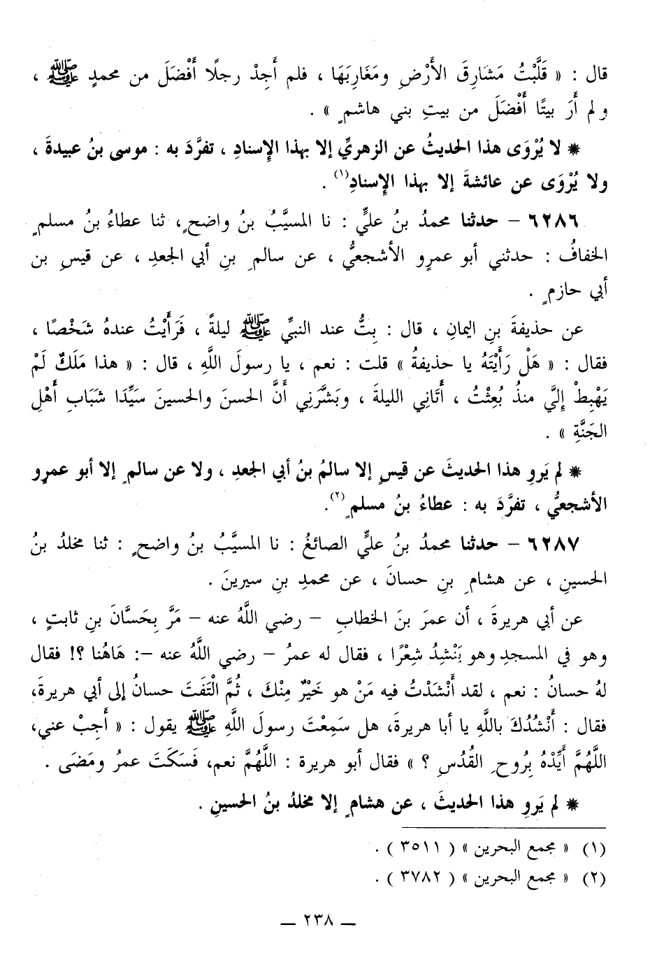 6286 - حَدَّثَنَا مُحَمَّدُ بْنُ عَلِيٍّ، نا الْمُسَيِّبُ بْنُ وَاضِحٍ، ثَنَا عَطَاءُ بْنُ مُسْلِمٍ الْخِفَافُ، حَدَّثَنِي أَبُو عَمْرٍو الْأَشْجَعِيُّ، عَنْ سَالِمِ بْنِ أَبِي الْجَعْدِ، عَنْ قَيْسِ بْنِ أَبِي حَازِمٍ، عَنْ حُذَيْفَةَ بْنِ الْيَمَانِ قَالَ: بِتُّ عِنْدَ النَّبِيِّ صَلَّى اللهُ عَلَيْهِ وَسَلَّمَ لَيْلَةً، فَرَأَيْتُ عِنْدَهُ شَخْصًا، فَقَالَ: «هَلْ رَأَيْتَهُ يَا حُذَيْفَةُ» قُلْتُ: نَعَمْ، يَا رَسُولَ اللَّهِ قَالَ: «هَذَا مَلَكٌ لَمْ يَهْبِطْ إِلَيَّ مُنْذُ بُعِثْتُ، أَتَانِي اللَّيْلَةَ، وَبَشَّرَنِي أَنَّ §الْحَسَنَ، وَالْحُسَيْنَ سَيِّدَا شَبَابِ أَهْلِ الْجَنَّةِ»