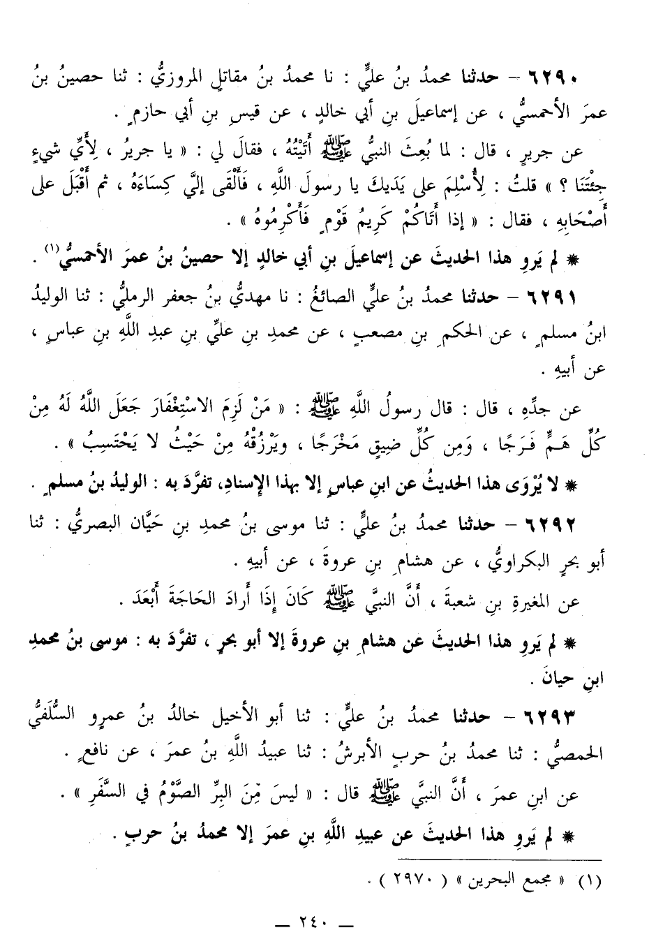 6290 - حَدَّثَنَا مُحَمَّدُ بْنُ عَلِيٍّ، نا مُحَمَّدُ بْنُ مُقَاتِلٍ الْمَرْوَزِيُّ، ثَنَا حُصَيْنُ بْنُ عُمَرَ الْأَحْمَسِيُّ، عَنْ إِسْمَاعِيلَ بْنِ أَبِي خَالِدٍ، عَنْ قَيْسِ بْنِ أَبِي حَازِمٍ، عَنْ جَرِيرٍ قَالَ: لَمَّا بُعِثَ النَّبِيُّ صَلَّى اللهُ عَلَيْهِ وَسَلَّمَ أَتَيْتُهُ، فَقَالَ لِي: «يَا جَرِيرُ، لِأَيِّ شَيْءٍ جِئْتَنَا؟» قُلْتُ: لِأُسْلِمَ عَلَى يَدَيْكَ يَا رَسُولَ اللَّهِ، فَأَلْقَى إِلَيَّ كِسَاءَهُ، ثُمَّ أَقْبَلَ عَلَى أَصْحَابِهِ، فَقَالَ: «§إِذَا أَتَاكُمْ كَرِيمُ قَوْمٍ فَأَكْرِمُوهُ»
