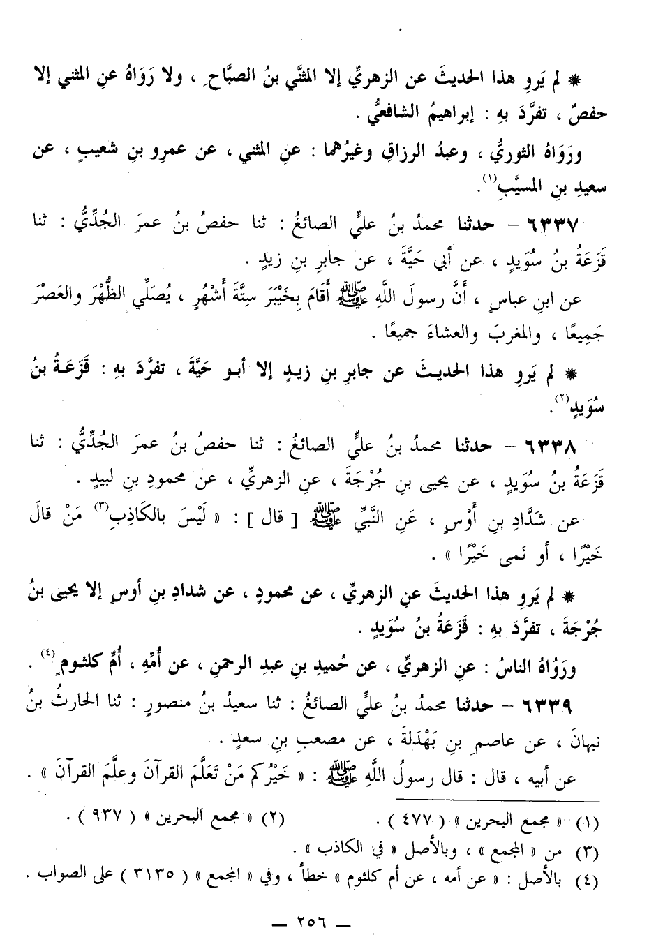 6339 - حَدَّثَنَا مُحَمَّدُ بْنُ عَلِيٍّ الصَّائِغُ، ثَنَا سَعِيدُ بْنُ مَنْصُورٍ، ثَنَا الْحَارِثُ بْنُ نَبْهَانَ، عَنْ عَاصِمِ بْنِ بَهْدَلَةَ، عَنْ مُصْعَبِ بْنِ سَعْدٍ، عَنْ أَبِيهِ قَالَ: قَالَ رَسُولُ اللَّهِ صَلَّى اللهُ عَلَيْهِ وَسَلَّمَ: «§خَيْرُكُمْ مَنْ تَعَلَّمَ الْقُرْآنَ وَعَلَّمَ الْقُرْآنَ» -[257]- لَمْ يُرْوَ هَذَا الْحَدِيثُ عَنْ سَعْدٍ إِلَّا بِهَذَا الْإِسْنَادِ، تَفَرَّدَ بِهِ الْحَارِثُ بْنُ نَبْهَانَ "
