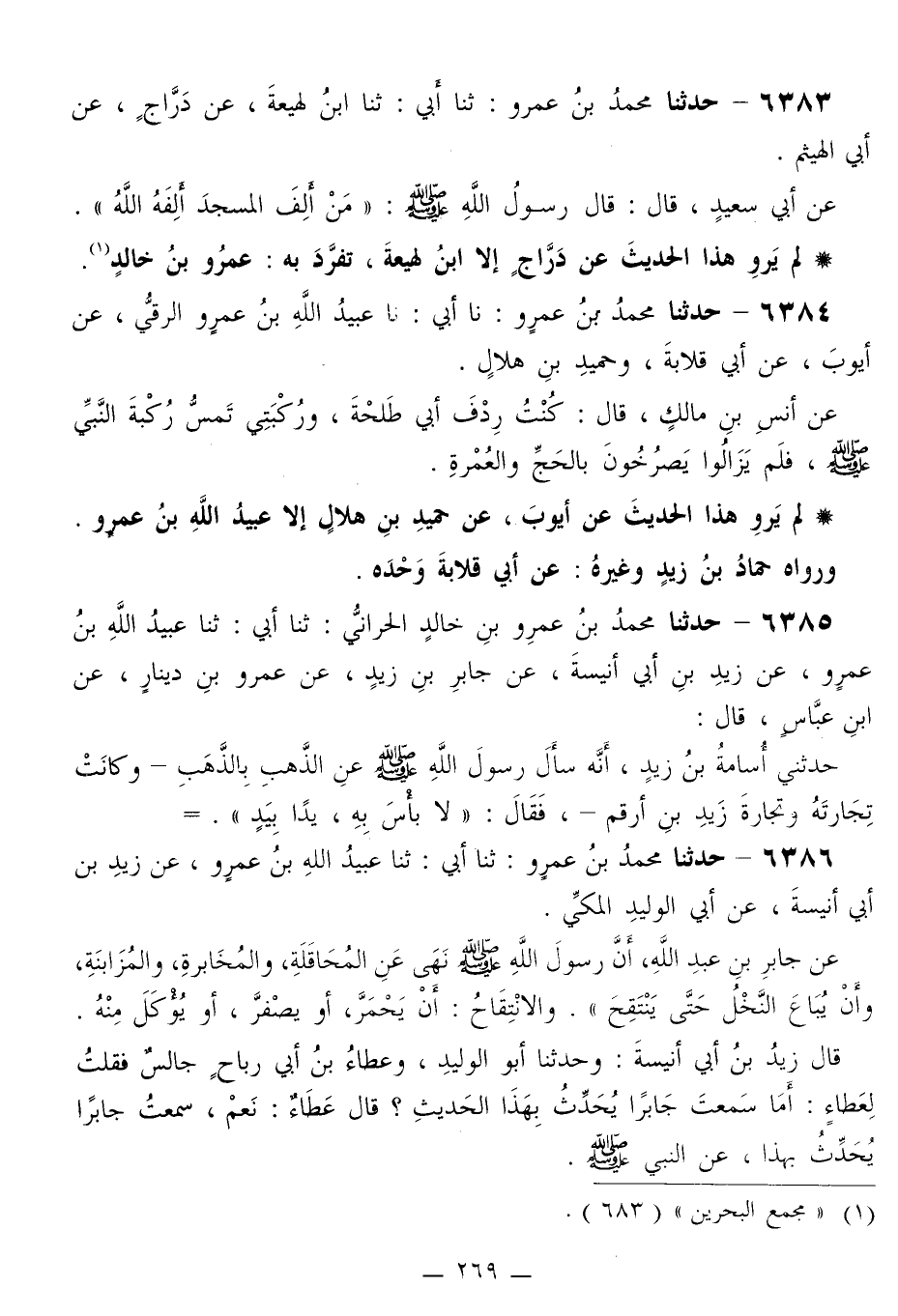6385 - حَدَّثَنَا مُحَمَّدُ بْنُ عَمْرِو بْنِ خَالِدٍ الْحَرَّانِيُّ، ثَنَا أَبِي، ثَنَا عُبَيْدُ اللَّهِ بْنُ عَمْرٍو، عَنْ زَيْدِ بْنِ أَبِي أُنَيْسَةَ، عَنْ جَابِرِ بْنِ زَيْدٍ، عَنْ عَمْرِو بْنِ دِينَارٍ، عَنِ ابْنِ عَبَّاسٍ قَالَ: حَدَّثَنِي أُسَامَةُ بْنُ زَيْدٍ، أَنَّهُ §سَأَلَ رَسُولَ اللَّهِ صَلَّى اللهُ عَلَيْهِ وَسَلَّمَ عَنِ الذَّهَبِ بِالذَّهَبِ، وَكَانَتْ تِجَارَتُهُ وَتِجَارَةُ زَيْدِ بْنِ أرْقَمَ، فَقَالَ: «لَا بَأَسَ بِهِ، يَدًا بِيَدٍ»