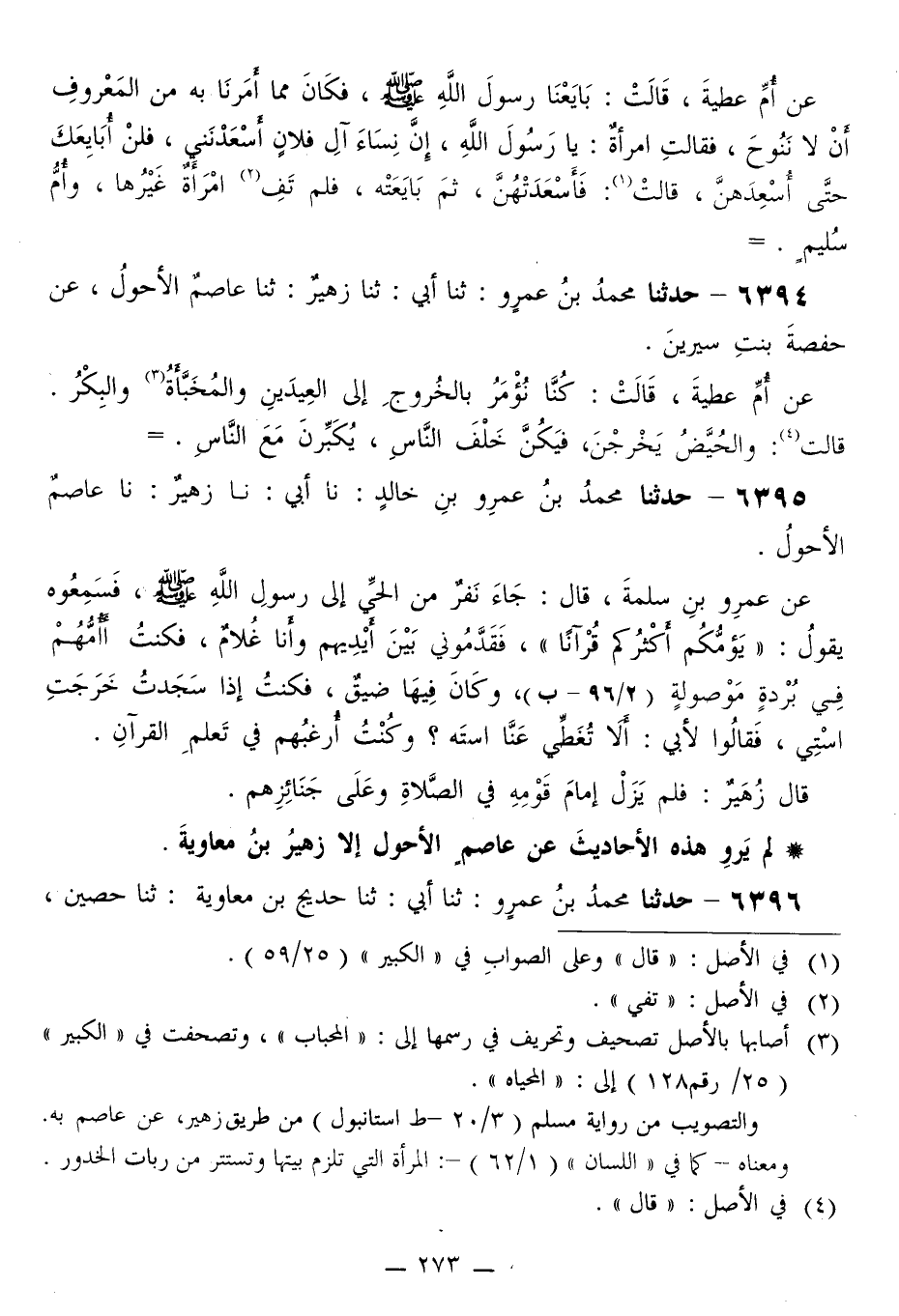 6394 - حَدَّثَنَا مُحَمَّدُ بْنُ عَمْرٍو، ثَنَا أَبِي، ثَنَا زُهَيْرٌ، ثَنَا عَاصِمٌ الْأَحْوَلُ، عَنْ حَفْصَةَ بِنْتِ سِيرِينَ، عَنْ أُمِّ عَطِيَّةَ، قَالَتْ: «§كُنَّا نُؤْمَرُ بِالْخُرُوجِ إِلَى الْعِيدَيْنِ وَالْمُخَبَّأَةُ وَالْبِكْرُ» . قَالَتْ: «وَالْحُيَّضُ يَخْرُجْنَ، فَيَكُنَّ خَلْفَ النَّاسِ، يُكَبِّرْنَ مَعَ النَّاسِ»