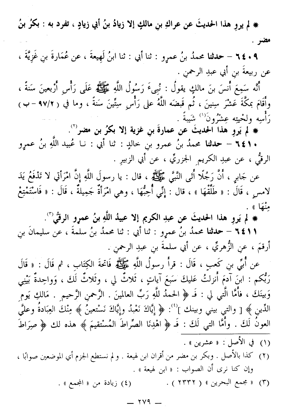 6411 - حَدَّثَنَا مُحَمَّدُ بْنُ عَمْرٍو، ثَنَا أَبِي، ثَنَا مُحَمَّدُ بْنُ سَلَمَةَ، عَنْ سُلَيْمَانَ بْنِ أَرْقَمَ، عَنِ الزُّهْرِيِّ، عَنْ أَبِي سَلَمَةَ بْنِ عَبْدِ الرَّحْمَنِ، عَنْ أُبَيِّ بْنِ كَعْبٍ قَالَ: قَرَأَ رَسُولُ اللَّهِ صَلَّى اللهُ عَلَيْهِ وَسَلَّمَ فَاتِحَةَ الْكِتَابِ، ثُمَّ قَالَ: «قَالَ رَبُّكُمْ: §ابْنَ آدَمَ، أَنْزَلْتُ عَلَيْكَ سَبْعَ آيَاتٍ، ثَلَاثٌ لِي، وَثَلَاثٌ لَكَ، وَوَاحِدَةٌ بَيْنِي وَبَيْنَكَ، فَأَمَّا الَّتِي لِي: فَ {الْحَمْدُ لِلَّهِ رَبِّ الْعَالَمِينَ الرَّحْمَنِ الرَّحِيمِ مَالِكِ يَوْمِ الدِّينِ} ، وَالَّتِي بَيْنِي وَبَيْنَكَ: {إِيَّاكَ نَعْبُدُ وَإِيَّاكَ نَسْتَعِينُ} [الفاتحة: 5] : مِنْكَ الْعِبَادَةُ وَعَلَيَّ الْعَوْنُ لَكَ، وَأَمَّا الَّتِي لَكَ: فَ {اهْدِنَا الصِّرَاطَ الْمُسْتَقِيمَ} [الفاتحة: 6] هَذِهِ لَكَ: {صِرَاطَ -[280]- الَّذِينَ أَنْعَمْتَ عَلَيْهِمْ غَيْرِ الْمَغْضُوبِ عَلَيْهِمْ} [الفاتحة: 7] : الْيَهُودُ، {وَلَا الضَّالِّينَ} [الفاتحة: 7] : النَّصَارَى»