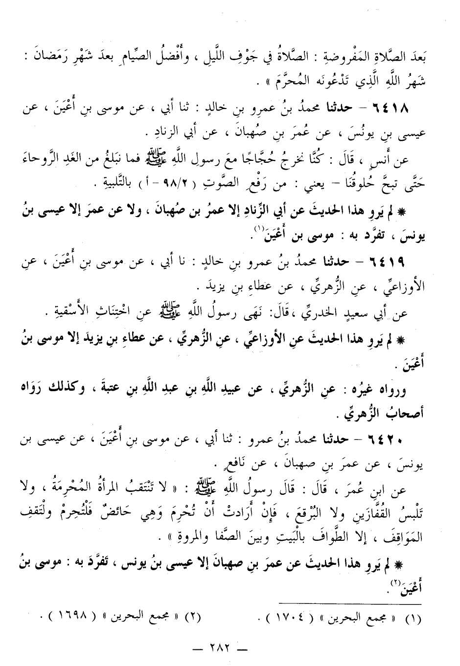 6418 - حَدَّثَنَا مُحَمَّدُ بْنُ عَمْرِو بْنِ خَالِدٍ، ثَنَا أَبِي، عَنْ مُوسَى بْنِ أَعْيَنَ، عَنْ عِيسَى بْنِ يُونُسَ، عَنْ عُمَرَ بْنِ صُهْبَانَ، عَنْ أَبِي الزِّنَادِ، عَنْ أَنَسٍ قَالَ: «§كُنَّا نَخْرُجُ حُجَّاجًا مَعَ رَسُولِ اللَّهِ صَلَّى اللهُ عَلَيْهِ وَسَلَّمَ، فَمَا نَبْلُغُ مِنَ الْغَدِ الرَّوْحَاءَ حَتَّى تُبَحَّ حُلُوقُنَا، - يَعْنِي، مِنْ رَفَعِ الصَّوْتِ بِالتَّلْبِيَةِ»