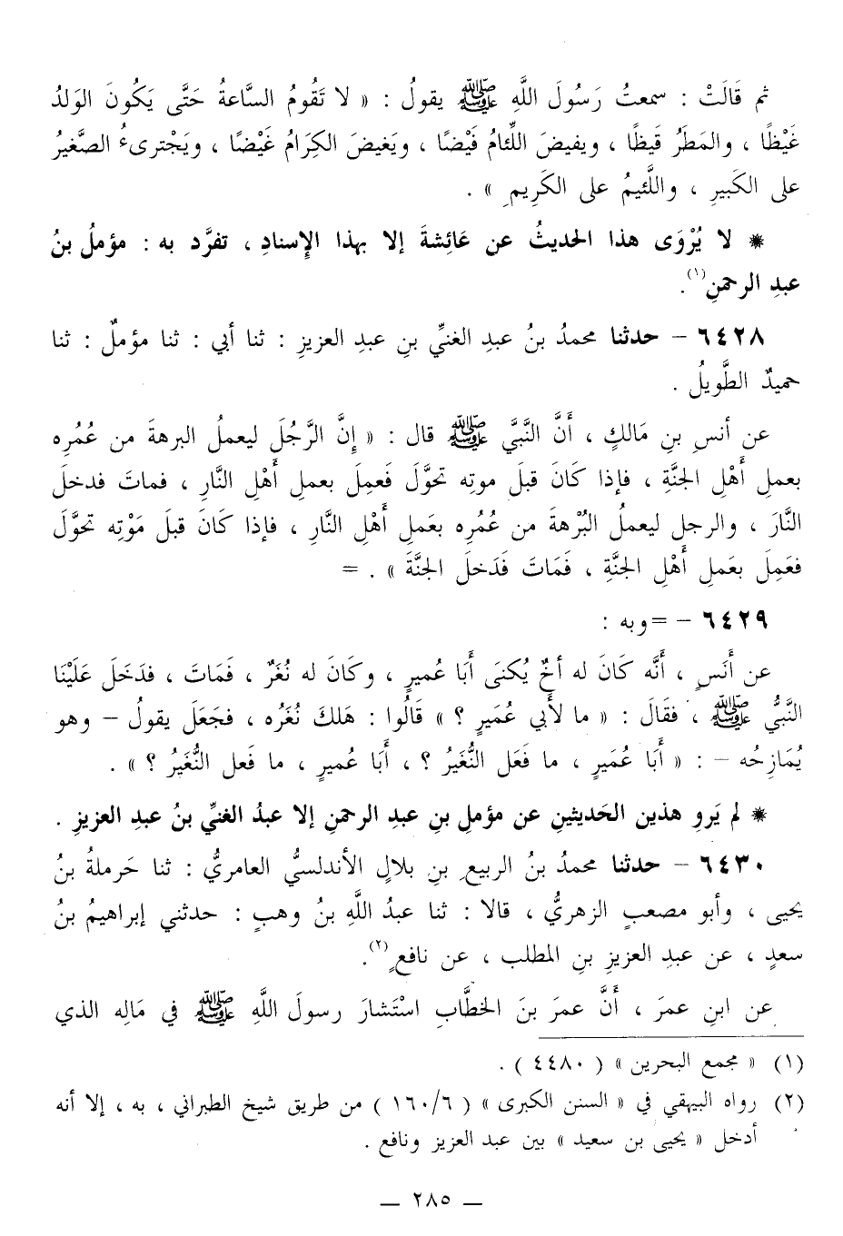 6428 - حَدَّثَنَا مُحَمَّدُ بْنُ عَبْدِ الْغَنِيِّ بْنِ عَبْدِ الْعَزِيزِ، ثَنَا أَبِي، ثَنَا مُؤَمَّلٌ، ثَنَا حُمَيْدٌ الطَّوِيلُ، عَنْ أَنَسِ بْنِ مَالِكٍ، أنَّ النَّبِيَّ صَلَّى اللهُ عَلَيْهِ وَسَلَّمَ قَالَ: «إِنَّ §الرَّجُلَ لَيَعْمَلُ الْبُرْهَةَ مِنْ عُمُرِهِ بِعَمَلِ أَهْلِ الْجَنَّةِ، فَإِذَا كَانَ قَبْلَ مَوْتِهِ تُحَوَّلَ فَعَمِلَ بِعَمَلِ أَهْلِ النَّارِ، فَمَاتَ فَدَخَلَ النَّارَ، وَالرَّجُلُ لَيَعْمَلُ الْبُرْهَةَ مِنْ عُمُرِهِ بِعَمَلِ أَهْلِ النَّارِ، فَإِذَا كَانَ قَبْلَ مَوْتِهِ تُحَوَّلَ فَعَمِلَ بِعَمَلِ أَهْلِ الْجَنَّةِ، فَمَاتَ فَدَخَلَ الْجَنَّةَ»