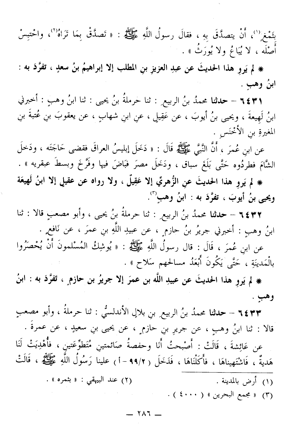 6432 - حَدَّثَنَا مُحَمَّدُ بْنُ الرَّبِيعِ، ثَنَا حَرْمَلَةُ بْنُ يَحْيَى، وَأَبُو مُصْعَبٍ، قَالَا: ثَنَا ابْنُ وَهْبٍ، أَخْبَرَنِي جَرِيرُ بْنُ حَازِمٍ، عَنْ عُبَيْدِ اللَّهِ بْنِ عُمَرَ، عَنْ نَافِعٍ، عَنِ ابْنِ عُمَرَ قَالَ: قَالَ رَسُولُ اللَّهِ صَلَّى اللهُ عَلَيْهِ وَسَلَّمَ: «§يُوشِكُ الْمُسْلِمُونَ أَنْ يُحْصَرُوا بِالْمَدِينَةِ، حَتَّى يَكُونَ أَبَعْدَ مَسَالِحِهِمْ سِلَاحٌ»