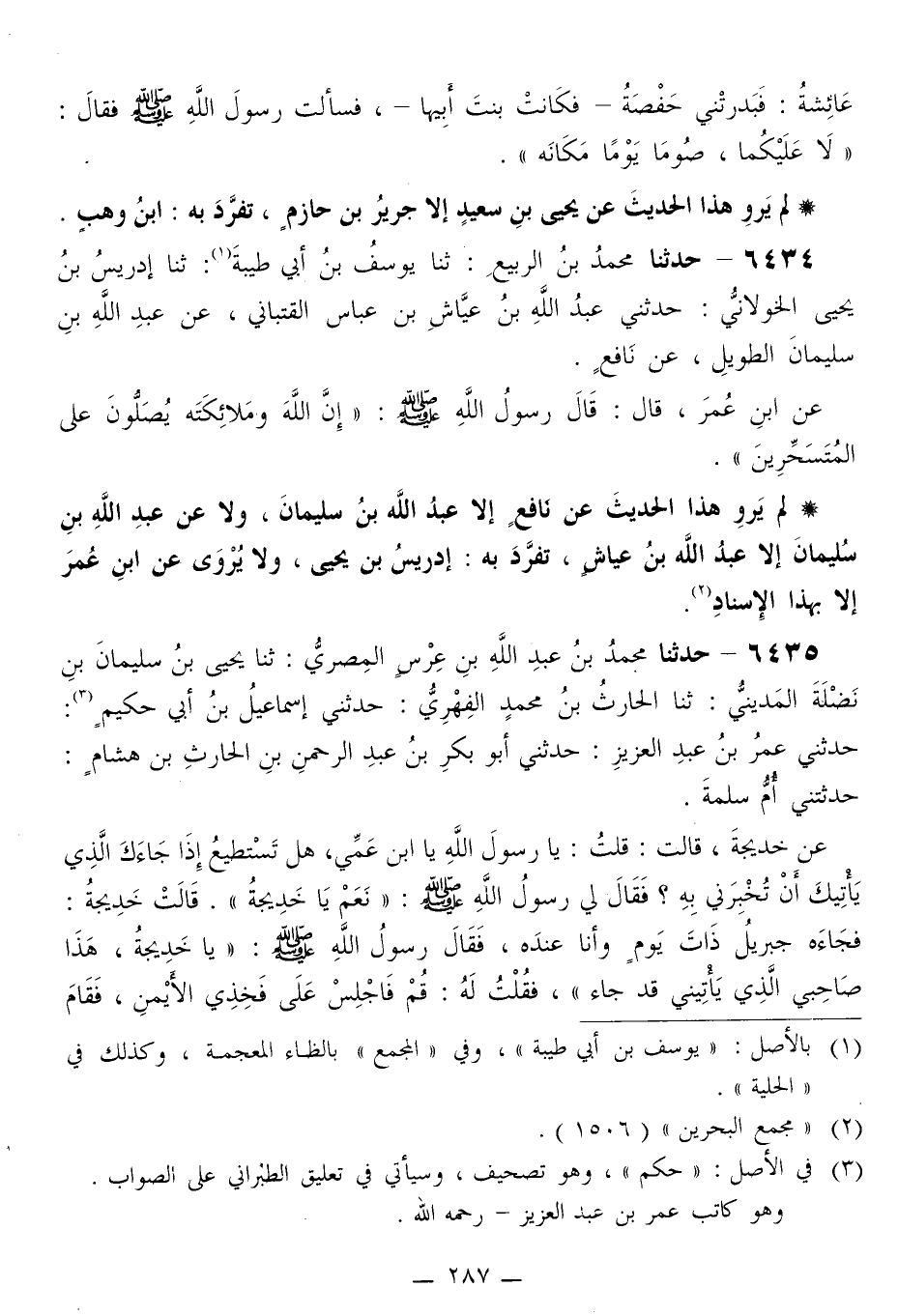 6435 - حَدَّثَنَا مُحَمَّدُ بْنُ عَبْدِ اللَّهِ بْنِ عِرْسٍ الْمِصْرِيُّ، ثَنَا يَحْيَى بْنُ سُلَيْمَانَ بْنِ نَضْلَةَ الْمَدِينِيُّ، ثَنَا الْحَارِثُ بْنُ مُحَمَّدٍ الْفِهْرِيُّ، حَدَّثَنِي إِسْمَاعِيلُ بْنُ أَبِي حَكِيمٍ، حَدَّثَنِي عُمَرُ بْنُ عَبْدِ الْعَزِيزِ، حَدَّثَنِي أَبُو بَكْرِ بْنِ عَبْدِ الرَّحْمَنِ بْنِ الْحَارِثِ بْنِ هِشَامٍ، حَدَّثَتْنِي أُمُّ سَلَمَةَ، عَنْ خَدِيجَةَ، قَالَتْ: قُلْتُ: يَا رَسُولَ اللَّهِ، يَا ابْنَ عَمِّي، هَلْ تَسْتَطِيعُ إِذَا جَاءَكَ الَّذِي يَأْتِيكَ أَنْ تُخْبِرَنِي بِهِ؟ فَقَالَ لِي رَسُولُ اللَّهِ صَلَّى اللهُ عَلَيْهِ وَسَلَّمَ: «نَعَمْ يَا خَدِيجَةُ» . قَالَتْ خَدِيجَةُ: فَجَاءَهُ جِبْرِيلُ ذَاتَ يَوْمٍ وَأَنَا عِنْدَهُ، فَقَالَ رَسُولُ اللَّهِ صَلَّى اللهُ عَلَيْهِ وَسَلَّمَ: «يَا خَدِيجَةُ §هَذَا صَاحِبِي الَّذِي يَأْتِينِي قَدْ جَاءَ» ، فَقُلْتُ لَهُ: قُمْ فَاجْلِسْ عَلَى فَخِدِيَ الْأَيْمَنِ، فَقَامَ، -[288]- فَجَلَسَ عَلَى فَخِدِيَ الْأَيْمَنِ، فَقُلْتُ لَهُ: هَلْ تَرَاهُ؟ قَالَ: «نَعَمْ» ، فَقُلْتُ لَهُ: تُحَوَّلْ فَاجْلِسْ عَلَى فَخِدِيَ الْأَيْسَرِ، فَجَلَسَ، فَقُلْتُ: هَلْ تَرَاهُ؟ قَالَ: «نَعَمْ» ، فَقُلْتُ لَهُ: فَتَحَوَّلَ فَاجْلِسْ فِي حِجْرِي، فَجَلَسَ، فَقَالَتْ لَهُ: هَلْ تَرَاهُ؟ قَالَ: «نَعَمْ» ، قَالَتْ خَدِيجَةُ: فَتَحَسَّرْتُ وَطَرَحْتُ خِمَارِي، وَقُلْتُ لَهُ: هَلْ تَرَاهُ؟ قَالَ: «لَا» ، فَقُلْتُ لَهُ: هَذَا وَاللَّهِ مَلَكٌ كَرِيمٌ، لَا وَاللَّهِ مَا هَذَا شَيْطَانٌ، قَالَتْ خَدِيجَةُ: فَقُلْتُ لِوَرَقَةَ بْنِ نَوْفَلِ بْنِ أَسَدِ بْنِ عَبْدِ الْعُزَّى بْنِ قُصَيٍّ ذَلِكَ، كَمَا أَخْبَرَنِي بِهِ مُحَمَّدٌ رَسُولُ اللَّهِ فَقَالَ وَرَقَةُ: حَقًّا يَا خَدِيجَةُ حَدِيثُكِ لَمْ يَرْوِ هَذَا الْحَدِيثَ عَنْ عُمَرَ بْنِ عَبْدِ الْعَزِيزِ إِلَّا إِسْمَاعِيلُ بْنُ أَبِي حَكِيمٍ، وَلَا عَنْ إِسْمَاعِيلَ إِلَّا الْحَارِثُ بْنُ مُحَمَّدٍ الْفِهْرِيُّ، تَفَرَّدَ بِهِ يَحْيَى بْنُ سُلَيْمَانَ