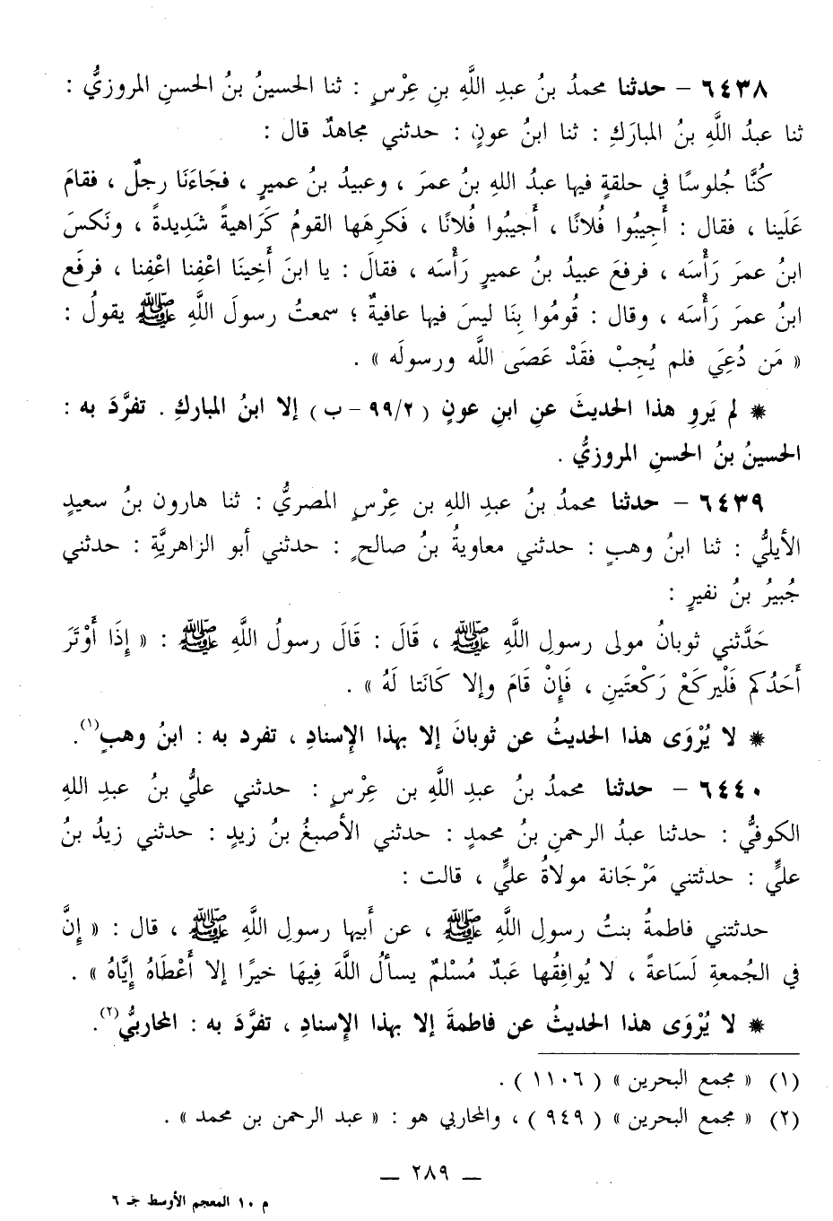 6440 - حَدَّثَنَا مُحَمَّدُ بْنُ عَبْدِ اللَّهِ بْنِ عِرْسٍ، حَدَّثَنِي عَلِيُّ بْنُ عَبْدِ اللَّهِ الْكُوفِيُّ، حَدَّثَنَا عَبْدُ الرَّحْمَنِ بْنُ مُحَمَّدٍ، حَدَّثَنِي الْأَصْبَغُ بْنُ زَيْدٍ، حَدَّثَنِي زَيْدُ بْنُ عَلِيٍّ، حَدَّثَتْنِي مَرْجَانَةُ، مَوْلَاةُ عَلِيٍّ، قَالَتْ: حَدَّثَتْنِي فَاطِمَةُ بِنْتُ رَسُولِ اللَّهِ صَلَّى اللهُ عَلَيْهِ وَسَلَّمَ، عَنْ أَبِيهَا رَسُولِ اللَّهِ صَلَّى اللهُ عَلَيْهِ وَسَلَّمَ قَالَ: «إِنَّ §فِي الْجُمُعَةِ لَسَاعَةً، لَا يُوَافِقُهَا عَبْدٌ مُسْلِمٌ يَسْأَلُ اللَّهَ فِيهَا خَيْرًا إِلَّا أَعْطَاهُ إِيَّاهُ» . «