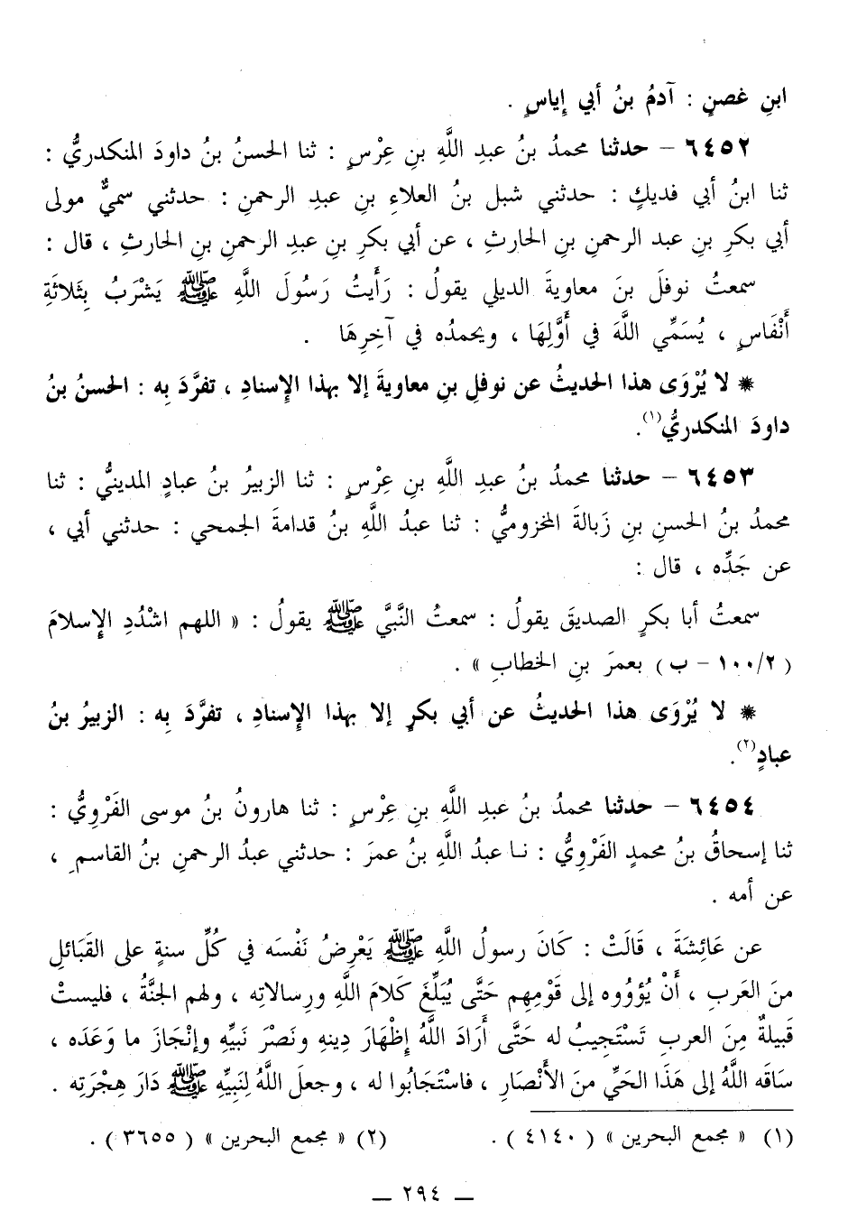 6454 - حَدَّثَنَا مُحَمَّدُ بْنُ عَبْدِ اللَّهِ بْنِ عِرْسٍ، ثَنَا هَارُونُ بْنُ مُوسَى الْفَرْوِيُّ، ثَنَا إِسْحَاقُ بْنُ مُحَمَّدٍ الْفَرْوِيُّ، نا عَبْدُ اللَّهِ بْنُ عُمَرَ، حَدَّثَنِي عَبْدُ الرَّحْمَنِ بْنُ الْقَاسِمِ، عَنْ أُمَّهُ، عَنْ عَائِشَةَ، قَالَتْ: «كَانَ رَسُولُ اللَّهِ صَلَّى اللهُ عَلَيْهِ وَسَلَّمَ §يَعْرِضُ نَفْسَهُ فِي كُلِّ سَنَةٍ عَلَى الْقَبَائِلِ مِنَ الْعَرَبِ أَنْ يُؤُوُوهُ إِلَى قَوْمِهِمْ، حَتَّى يُبَلِّغَ كَلَامَ اللَّهِ وَرِسَالِاتِهِ، وَلَهُمُ الْجَنَّةَ، فَلَيْسَتْ قَبِيلَةٌ مِنَ الْعَرَبِ تَسْتَجِيبُ لَهُ حَتَّى أَرَادَ اللَّهُ إِظْهَارَ دِينِهُ، وَنَصْرَ نَبِيِّهِ وَإِنْجَازَ مَا وَعْدَهُ، سَاقُهُ اللَّهُ إِلَى هَذَا الْحَيِّ مِنَ الْأَنْصَارِ، فَاسْتَجَابُوا لَهُ، وَجَعَلَ اللَّهُ لِنَبِيِّهِ صَلَّى اللهُ عَلَيْهِ وَسَلَّمَ دَارَ هِجْرَتِهِ» -[295]- لَمْ يَرْوِ هَذَا الْحَدِيثَ عَنْ عَبْدِ الرَّحْمَنِ بْنِ الْقَاسِمِ إِلَّا عَبْدُ اللَّهِ بْنُ عُمَرَ، وَلَا عَنْ عَبْدِ اللَّهِ بْنِ عُمَرَ إِلَّا إِسْحَاقُ الْفَرْوِيُّ، تَفَرَّدَ بِهِ هَارُونُ الْفَرْوِيُّ "