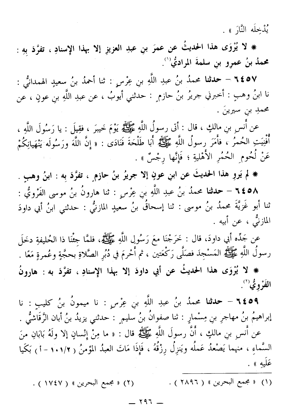 6457 - حَدَّثَنَا مُحَمَّدُ بْنُ عَبْدِ اللَّهِ بْنِ عِرْسٍ، ثَنَا أَحْمَدُ بْنُ سَعِيدٍ الْهَمْدَانِيُّ، نا ابْنُ وَهْبٍ، أَخْبَرَنِي جَرِيرُ بْنُ حَازِمٍ، حَدَّثَنِي أَيُّوبُ، عَنْ عَبْدِ اللَّهِ بْنِ عَوْنٍ، عَنْ مُحَمَّدِ بْنِ سِيرِينَ، عَنْ أَنَسِ بْنِ مَالِكٍ قَالَ: أَتَى رَسُولُ اللَّهِ صَلَّى اللهُ عَلَيْهِ وَسَلَّمَ يَوْمَ خَيْبَرَ، فَقِيلَ: يَا رَسُولَ اللَّهِ أُفْنِيَتِ الْحُمُرِ، فَأَمَرَ رَسُولُ اللَّهِ صَلَّى اللهُ عَلَيْهِ وَسَلَّمَ أَبَا طَلْحَةَ، فَنَادَى: «إِنَّ §اللَّهَ وَرَسُولَهَ يَنْهَيَانِكُمْ عَنْ لُحُومِ الْحُمُرِ الْأَهْلِيَّةِ، فَإِنَّهَا رِجْسٌ»