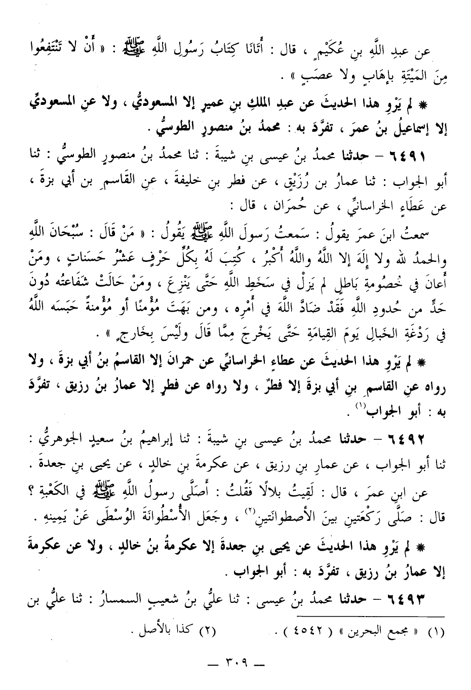 6491 - حَدَّثَنَا مُحَمَّدُ بْنُ عِيسَى بْنِ شَيْبَةَ، ثَنَا مُحَمَّدُ بْنُ مَنْصُورٍ الطُّوسِيُّ، ثَنَا أَبُو الْجَوَّابِ، ثَنَا عَمَّارُ بْنُ رُزَيْقٍ، عَنْ فِطْرِ بْنِ خَلِيفَةَ، عَنِ الْقَاسِمِ بْنِ أَبِي بَزَّةَ، عَنْ عَطَاءٍ الْخُرَاسَانِيُّ، عَنْ حُمْرَانَ قَالَ: سَمِعْتُ ابْنَ عُمَرَ، يَقُولُ: سَمِعْتُ رَسُولَ اللَّهِ صَلَّى اللهُ عَلَيْهِ وَسَلَّمَ يَقُولُ: «§مَنْ قَالَ: سُبْحَانَ اللَّهِ، وَالْحَمْدُ لِلَّهِ وَلَا إِلَهَ إِلَّا اللَّهُ، وَاللَّهُ أَكْبَرُ، كُتِبَ لَهُ بِكُلِّ حَرْفٍ عَشْرُ حَسَنَاتٍ، وَمَنْ أَعَانَ فِي خُصُومَةِ بَاطِلٍ لَمْ يَزَلْ فِي سَخَطِ اللَّهِ حَتَّى يَنْزِعَ، وَمَنْ حَالَتْ شَفَاعَتُهُ دُونَ حَدٍّ مِنْ حُدُودِ اللَّهِ فَقَدْ ضَادَّ اللَّهَ فِي أَمْرِهِ، وَمَنْ بَهَتَ مُؤْمِنًا أَوْ مُؤْمِنَةً حَبَسَهُ اللَّهُ فِي رَدْغَةِ الْخَبَالِ يَوْمَ الْقِيَامَةِ حَتَّى يَخْرُجَ مِمَّا قَالَ وَلَيْسَ بِخَارِجٍ»