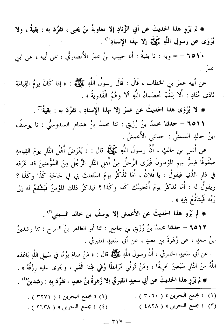 6510 - وَبِهِ نا بَقِيَّةُ، أَنَا حَبِيبُ بْنُ عُمَرَ الْأَنْصَارِيُّ، عَنْ أَبِيهِ، عَنِ ابْنِ عُمَرَ، عَنْ أَبِيهِ عُمَرَ بْنِ الْخَطَّابِ قَالَ: قَالَ رَسُولُ اللَّهِ صَلَّى اللهُ عَلَيْهِ وَسَلَّمَ: «§إِذَا كَانَ يَوْمُ الْقِيَامَةِ نَادَى مُنَادٍ: أَلَا لِيَقُمْ خُصَمَاءُ اللَّهِ، أَلَا وَهُمُ الْقَدَرِيَّةُ»