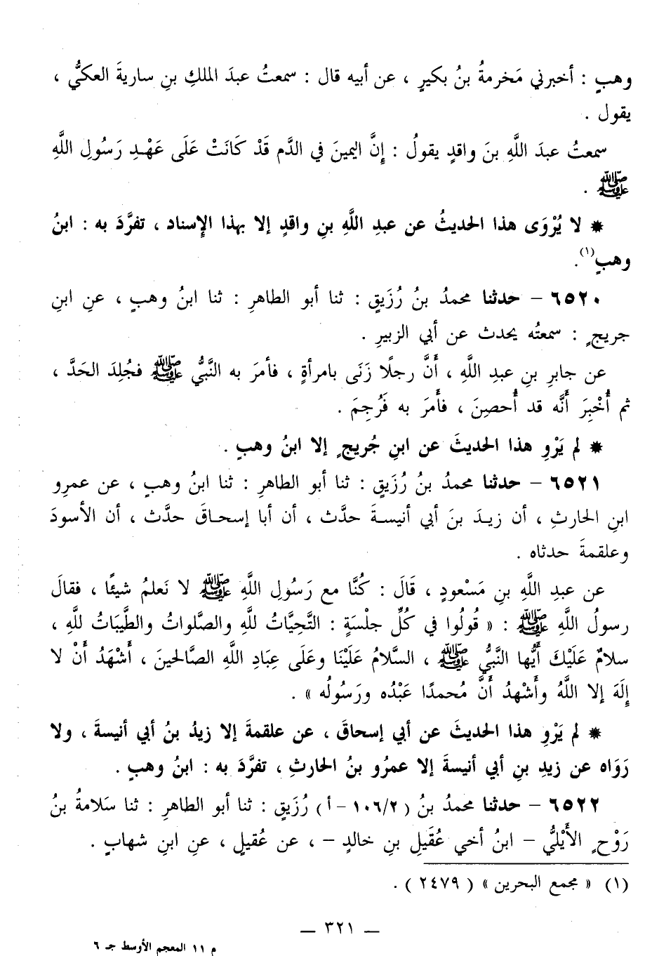 6521 - حَدَّثَنَا مُحَمَّدُ بْنُ رُزَيْقٍ، ثَنَا أَبُو الطَّاهِرِ، ثَنَا ابْنُ وَهْبٍ، عَنْ عَمْرِو بْنِ الْحَارِثِ، أَنَّ زَيْدَ بْنَ أَبِي أُنَيْسَةَ حَدَّثَ أَنَّ أَبَا إِسْحَاقَ حَدَّثَ أَنَّ الْأَسْوَدَ، وعَلْقَمَةَ حَدَّثَاهُ، عَنْ عَبْدِ اللَّهِ بْنِ مَسْعُودٍ قَالَ: كُنَّا مَعَ رَسُولِ اللَّهِ صَلَّى اللهُ عَلَيْهِ وَسَلَّمَ لَا نَعْلَمُ شَيْئًا، فَقَالَ رَسُولُ اللَّهِ صَلَّى اللهُ عَلَيْهِ وَسَلَّمَ: «§قُولُوا فِي كُلِّ جَلْسَةٍ: التَّحِيَّاتُ لِلَّهِ وَالصَّلَوَاتُ الطَّيِّبَاتُ لِلَّهِ، سَلَامٌ عَلَيْكَ أَيُّهَا النَّبِيُّ صَلَّى اللهُ عَلَيْهِ وَسَلَّمَ، السَّلَامُ عَلَيْنَا وَعَلَى عَبَّادِ اللَّهِ الصَّالِحِينَ، أَشْهَدُ أَنْ لَا إِلَهَ إِلَّا اللَّهُ وَأَشْهَدُ أَنَّ مُحَمَّدًا عَبْدُهُ وَرَسُولُهُ»