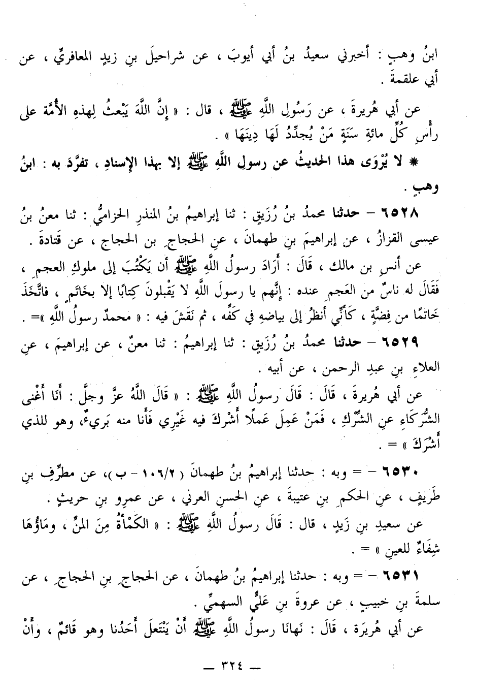 6530 - وَبِهِ حَدَّثَنَا إِبْرَاهِيمُ بْنُ طَهْمَانَ، عَنْ مُطَرِّفِ بْنِ طَرِيفٍ، عَنِ الْحَكَمِ بْنِ عُتَيْبَةَ، عَنِ الْحَسَنِ الْعُرَنِيِّ، عَنْ عَمْرِو بْنِ حُرَيْثٍ، عَنْ سَعِيدِ بْنِ زَيْدٍ قَالَ: قَالَ رَسُولُ اللَّهِ صَلَّى اللهُ عَلَيْهِ وَسَلَّمَ: «§الْكَمْأَةُ مِنَ الْمَنِّ، وَمَاؤُهَا شِفَاءٌ لِلْعَيْنِ»