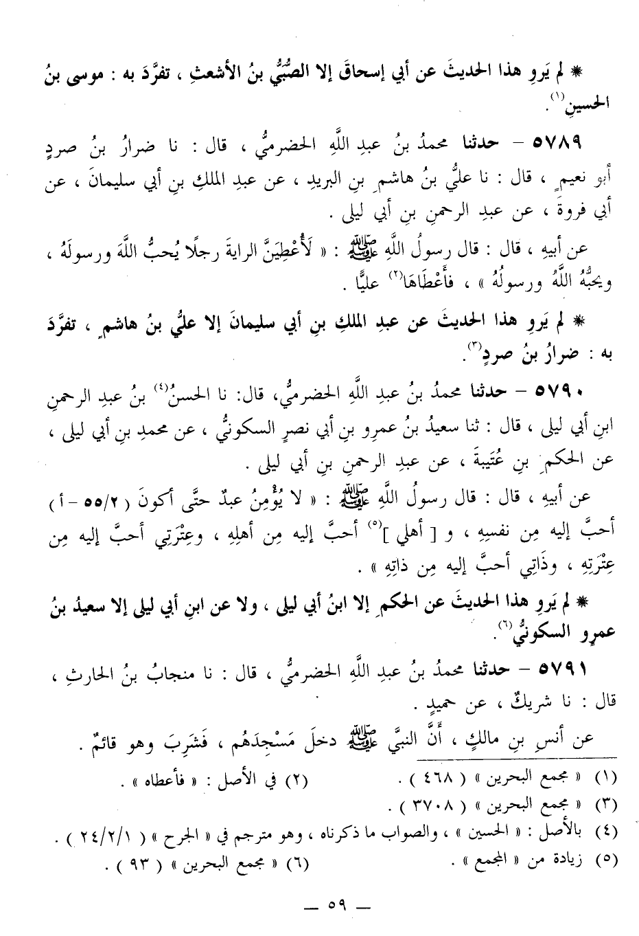 5790 - حَدَّثَنَا مُحَمَّدُ بْنُ عَبْدِ اللَّهِ الْحَضْرَمِيُّ قَالَ: نا الْحَسَنُ بْنُ عَبْدِ الرَّحْمَنِ بْنِ أَبِي لَيْلَى قَالَ: ثَنَا سَعِيدُ بْنُ عَمْرِو بْنِ أَبِي نَصْرٍ السَّكُونِيُّ، عَنْ مُحَمَّدِ بْنِ أَبِي لَيْلَى، عَنِ الْحَكَمِ بْنِ عُتَيْبَةَ، عَنْ عَبْدِ الرَّحْمَنِ بْنِ أَبِي لَيْلَى، عَنْ أَبِيهِ قَالَ: قَالَ رَسُولُ اللَّهِ صَلَّى اللهُ عَلَيْهِ وَسَلَّمَ: «§لَا يُؤْمِنُ عَبْدٌ حَتَّى أَكُونَ أَحَبَّ إِلَيْهِ مِنْ نَفْسِهِ، وَأَهْلِي أَحَبَّ إِلَيْهِ مِنْ أَهْلِهِ، وَعِتْرَتِي أَحَبَّ إِلَيْهِ مِنْ عِتْرَتِهِ، وَذَاتِي أَحَبَّ إِلَيْهِ مِنْ ذَاتِهِ»