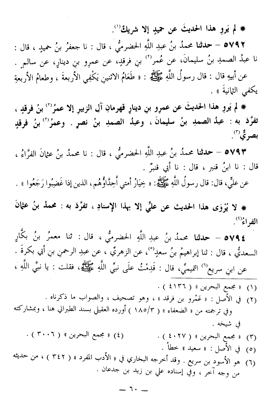 5792 - حَدَّثَنَا مُحَمَّدُ بْنُ عَبْدِ اللَّهِ الْحَضْرَمِيُّ قَالَ: نا جَعْفَرُ بْنُ حُمَيْدٍ قَالَ: نا عَبْدُ الصَّمَدِ بْنُ سُلَيْمَانَ، عَنْ عُمَرَ بْنِ فَرْقَدٍ، عَنْ عَمْرِو بْنِ دِينَارٍ، عَنْ سَالِمٍ، عَنْ أَبِيهِ قَالَ: قَالَ رَسُولُ اللَّهِ صَلَّى اللهُ عَلَيْهِ وَسَلَّمَ: «§طَعَامُ الِاثْنَيْنِ يَكْفِي الْأَرْبَعَةَ، وَطَعَامُ الْأَرْبَعَةِ يَكْفِي الثَّمَانِيَةَ»