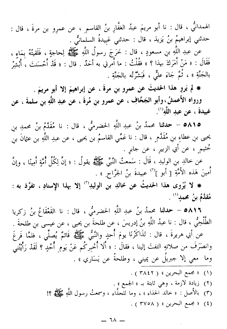 5815 - حَدَّثَنَا مُحَمَّدُ بْنُ عَبْدِ اللَّهِ الْحَضْرَمِيُّ قَالَ: نا مُقَدَّمُ بْنُ مُحَمَّدِ بْنِ يَحْيَى بْنِ عَطَاءِ بْنِ مُقَدَّمٍ قَالَ: نا عَمِّيَ الْقَاسِمُ بْنُ يَحْيَى، عَنْ عَبْدِ اللَّهِ بْنِ عُثْمَانَ بْنِ خُثَيْمٍ، عَنْ أَبِي الزُّبَيْرِ، عَنْ جَابِرٍ، عَنْ خَالِدِ بْنِ الْوَلِيدِ قَالَ: سَمِعْتُ النَّبِيَّ صَلَّى اللهُ عَلَيْهِ وَسَلَّمَ يَقُولُ: «إِنَّ §لِكُلِّ أُمَّةٍ أَمِينًا، وَإِنَّ أَمِينَ هَذِهِ الْأُمَّةِ أَبُو عُبَيْدَةَ بْنِ الْجَرَّاحِ»