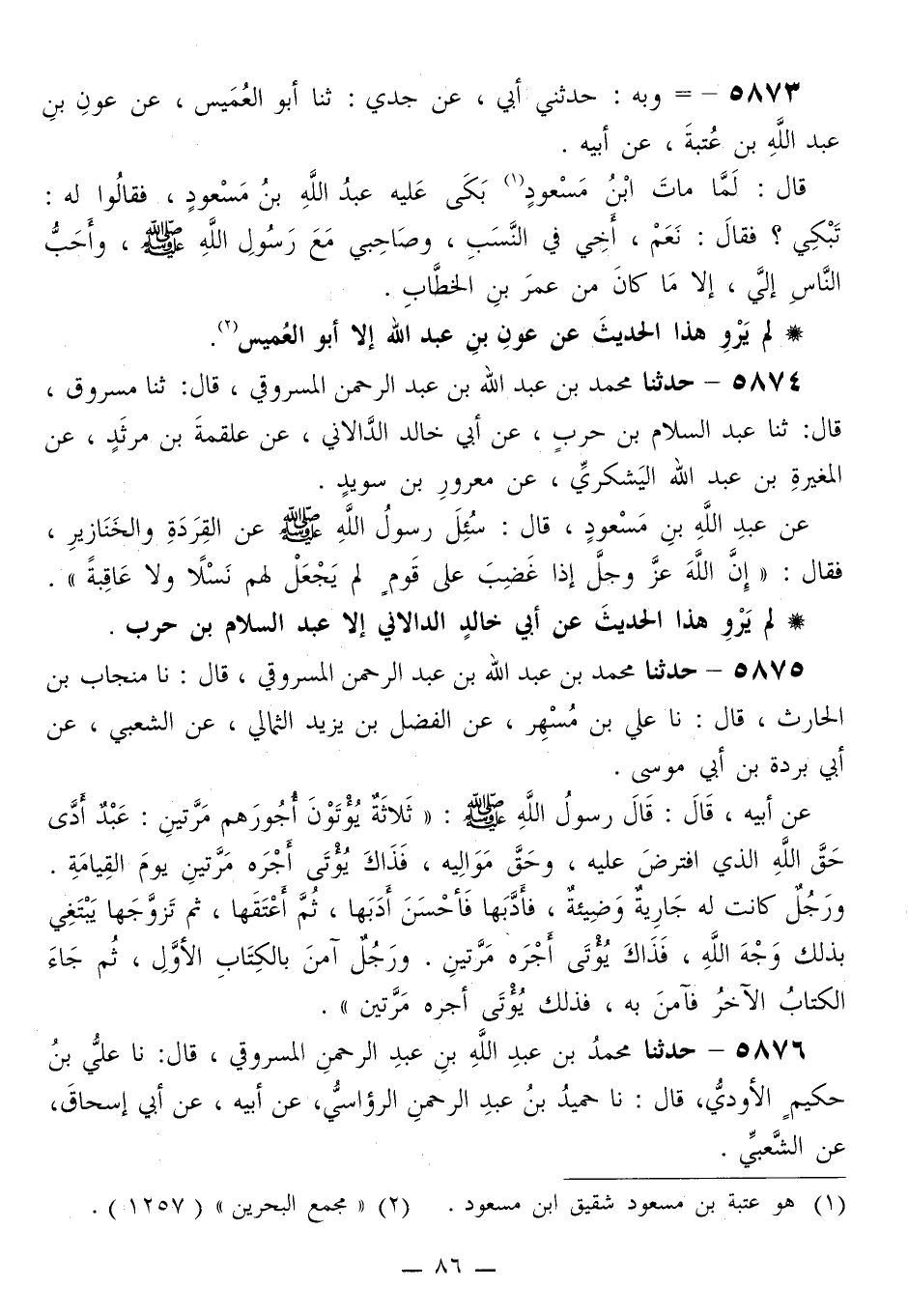 5873 - وَبِهِ: حَدَّثَنِي أَبِي، عَنْ جَدِّي، ثَنَا أَبُو الْعُمَيْسِ، عَنْ عَوْنِ بْنِ عَبْدِ اللَّهِ بْنِ عُتْبَةَ، عَنْ أَبِيهِ قَالَ: لَمَّا مَاتَ ابْنُ مَسْعُودٍ بَكَى عَلَيْهِ عَبْدُ اللَّهِ بْنُ مَسْعُودٍ، فَقَالُوا لَهُ: تَبْكِي؟ فَقَالَ: «نَعَمْ، §أَخِي فِي النَّسَبِ، وَصَاحِبِي مَعَ رَسُولِ اللَّهِ صَلَّى اللهُ عَلَيْهِ وَسَلَّمَ، وَأَحَبُّ النَّاسِ إِلَيَّ، إِلَّا مَا كَانَ مِنْ عُمَرَ بْنِ الْخَطَّابِ»
