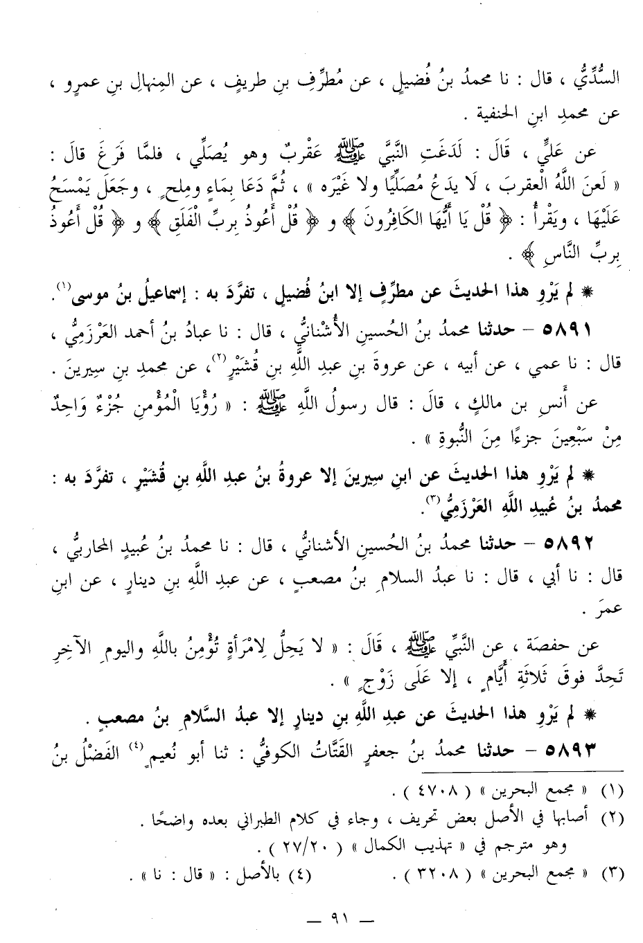 5892 - حَدَّثَنَا مُحَمَّدُ بْنُ الْحُسَيْنِ الْأَشْنَانِيُّ قَالَ: نا مُحَمَّدُ بْنُ عُبَيْدٍ الْمُحَارِبِيُّ قَالَ: نا أَبِي قَالَ: نا عَبْدُ السَّلَامِ بْنُ مُصْعَبٍ، عَنْ عَبْدِ اللَّهِ بْنِ دِينَارٍ، عَنِ ابْنِ عُمَرَ، عَنْ حَفْصَةَ، عَنِ النَّبِيِّ صَلَّى اللهُ عَلَيْهِ وَسَلَّمَ قَالَ: «§لَا يَحِلُّ لِامْرَأَةٍ تُؤْمِنُ بِاللَّهِ وَالْيَوْمِ الْآخِرِ تُحِدُّ فَوْقَ ثَلَاثَةِ أَيَّامٍ، إِلَّا عَلَى زَوْجٍ»