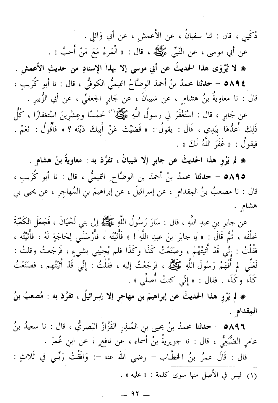 5894 - حَدَّثَنَا مُحَمَّدُ بْنُ أَحْمَدَ الْوَضَّاحُ التَّمِيمِيُّ الْكُوفِيُّ قَالَ: نا أَبُو كُرَيْبٍ قَالَ: نا مُعَاوِيَةُ بْنُ هِشَامٍ، عَنْ شَيْبَانَ، عَنْ جَابِرٍ الْجُعْفِيِّ، عَنْ أَبِي الزُّبَيْرِ، عَنْ جَابِرٍ قَالَ: اسْتَغْفَرَ لِي رَسُولُ اللَّهِ صَلَّى اللهُ عَلَيْهِ وَسَلَّمَ خَمْسًا وَعِشْرِينَ اسْتِغْفَارًا، كُلُّ ذَلِكَ أَعُدَّهَا بِيَدِي قَالَ: يَقُولُ: «§قَضَيْتَ عَنْ أَبِيكَ دِينَهُ؟» فَأَقُولُ: نَعَمْ. فَيَقُولُ: «غَفَرَ اللَّهُ لَكَ»