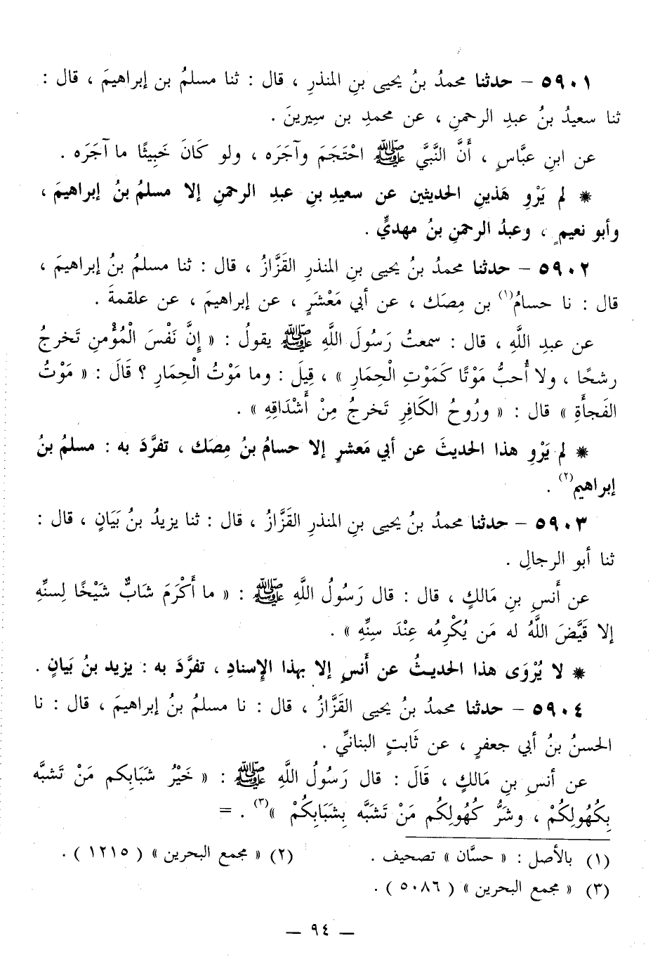 5902 - حَدَّثَنَا مُحَمَّدُ بْنُ يَحْيَى بْنِ الْمُنْذِرِ الْقَزَّازُ قَالَ: ثَنَا مُسْلِمُ بْنُ إِبْرَاهِيمَ قَالَ: نا حُسَامُ بْنُ مِصَكٍّ، عَنْ أَبِي مَعْشَرٍ، عَنْ إِبْرَاهِيمَ، عَنْ عَلْقَمَةَ، عَنْ عَبْدِ اللَّهِ قَالَ: سَمِعْتُ رَسُولَ اللَّهِ صَلَّى اللهُ عَلَيْهِ وَسَلَّمَ يَقُولُ: «إِنَّ §نَفْسَ الْمُؤْمِنِ تَخْرُجُ رَشْحًا، وَلَا أُحِبُّ مَوْتًا كَمَوْتِ الْحِمَارِ» ، قِيلَ: وَمَا مَوْتُ الْحِمَارِ؟ قَالَ: «مَوْتُ الْفَجْأَةِ» قَالَ: «وَرُوحُ الْكَافِرِ تَخْرُجُ مِنْ أَشْدَاقِهِ»