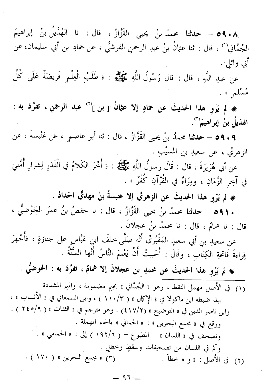 5908 - حَدَّثَنَا مُحَمَّدُ بْنُ يَحْيَى الْقَزَّازُ قَالَ: نا الْهُذَيْلُ بْنُ إِبْرَاهِيمَ الْحِمَّانِيُّ قَالَ: ثَنَا عُثْمَانُ بْنُ عَبْدِ الرَّحْمَنِ الْقُرَشِيُّ، عَنْ حَمَّادِ بْنِ أَبِي سُلَيْمَانَ، عَنْ أَبِي وَائِلٍ، عَنْ عَبْدِ اللَّهِ قَالَ: قَالَ رَسُولُ اللَّهِ صَلَّى اللهُ عَلَيْهِ وَسَلَّمَ: «§طَلَبُ الْعِلْمِ فَرِيضَةٌ عَلَى كُلِّ مُسْلِمٍ»
