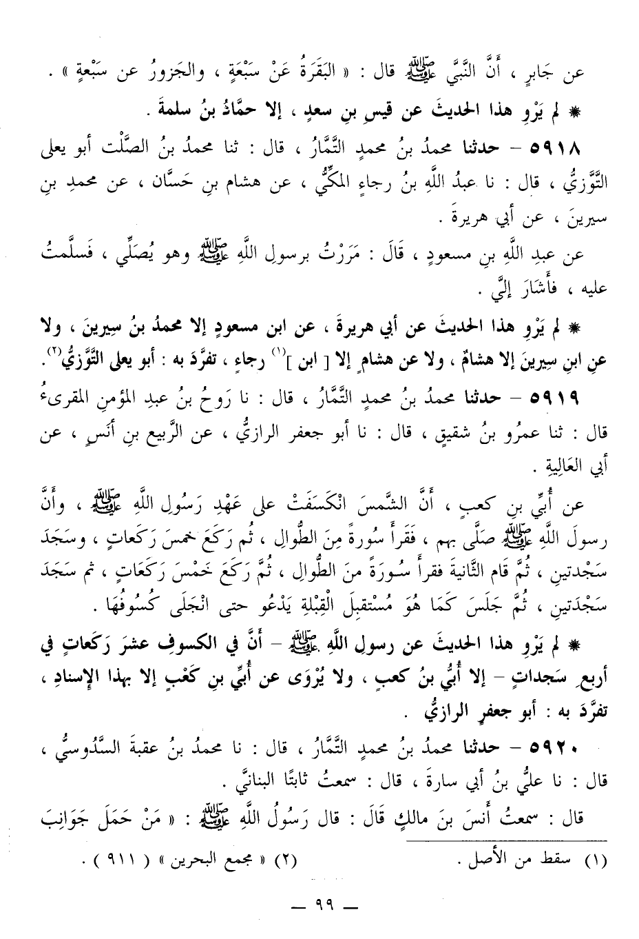 5919 - حَدَّثَنَا مُحَمَّدُ بْنُ مُحَمَّدٍ التَّمَّارُ قَالَ: نا رَوْحُ بْنُ عَبْدِ الْمُؤْمِنِ الْمُقْرِئُ قَالَ: ثَنَا عَمْرُو بْنُ شَقِيقٍ قَالَ: نا أَبُو جَعْفَرٍ الرَّازِيُّ، عَنِ الرَّبِيعِ بْنِ أَنَسٍ، عَنْ أَبِي الْعَالِيَةَ، عَنْ أُبَيِّ بْنِ كَعْبٍ: أَنَّ الشَّمْسَ، انْكَسَفَتْ عَلَى عَهْدِ رَسُولِ اللَّهِ صَلَّى اللهُ عَلَيْهِ وَسَلَّمَ، «وَأَنَّ رَسُولَ اللَّهِ صَلَّى اللهُ عَلَيْهِ وَسَلَّمَ §صَلَّى بِهِمْ، فَقَرَأَ سُورَةً مِنَ الطِّوَالِ، ثُمَّ رَكَعَ خَمْسَ رَكَعَاتٍ، وَسَجَدَ سَجْدَتَيْنِ، ثُمَّ قَامَ الثَّانِيَةَ فَقَرَأَ سُورَةً مِنَ الطِّوَالِ، ثُمَّ رَكَعَ خَمْسَ رَكَعَاتٍ، ثُمَّ سَجَدَ سَجْدَتَيْنِ ثُمَّ جَلَسَ كَمَا هُوَ مُسْتَقْبِلَ الْقِبْلَةَ يَدْعُو حَتَّى انْجَلَى كُسُوفُهَا»