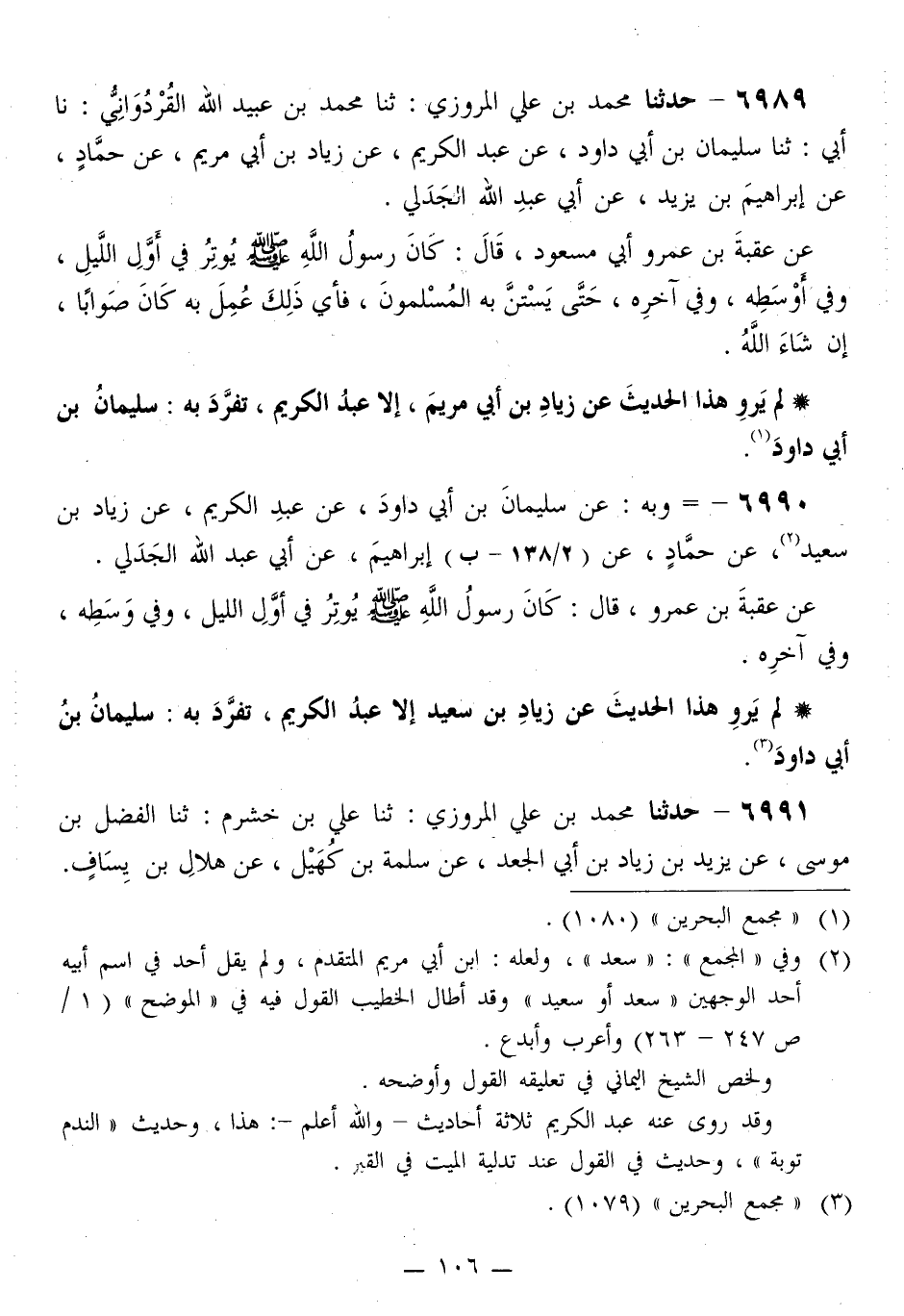 6990 - وَبِهِ: عَنْ سُلَيْمَانَ بْنِ أَبِي دَاوُدَ، عَنْ عَبْدِ الْكَرِيمِ، عَنْ زِيَادِ بْنِ سَعِيدٍ، عَنْ حَمَّادٍ، عَنْ إِبْرَاهِيمَ، عَنْ أَبِي عَبْدِ اللَّهِ الْجَدَلِيِّ، عَنْ عُقْبَةَ بْنِ عَمْرٍو قَالَ: «كَانَ رَسُولُ اللَّهِ صَلَّى اللهُ عَلَيْهِ وَسَلَّمَ §يُوتِرُ فِي أَوَّلِ اللَّيْلِ، وَفِي وَسَطِهِ، وَفِي آخِرِهِ» . «